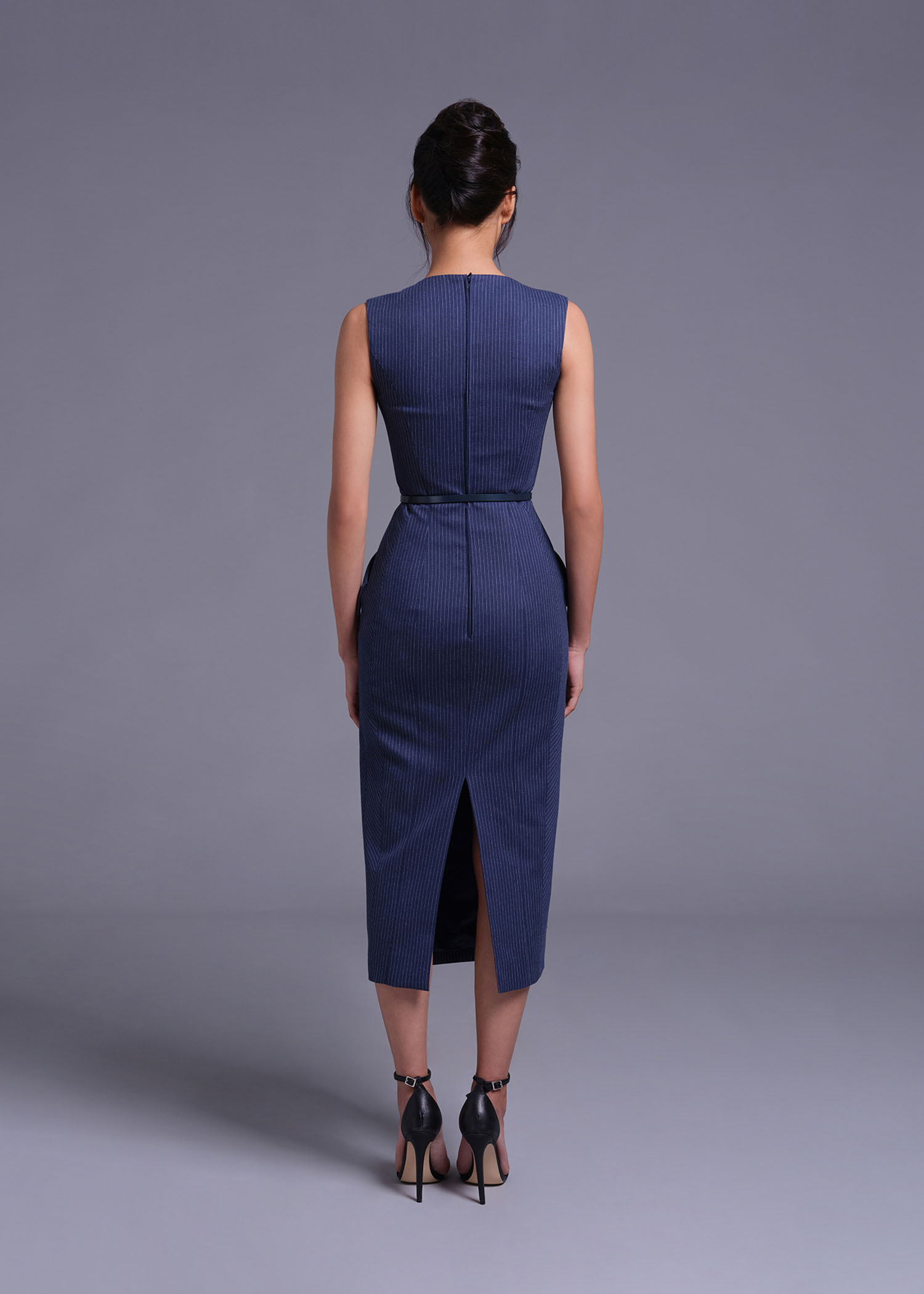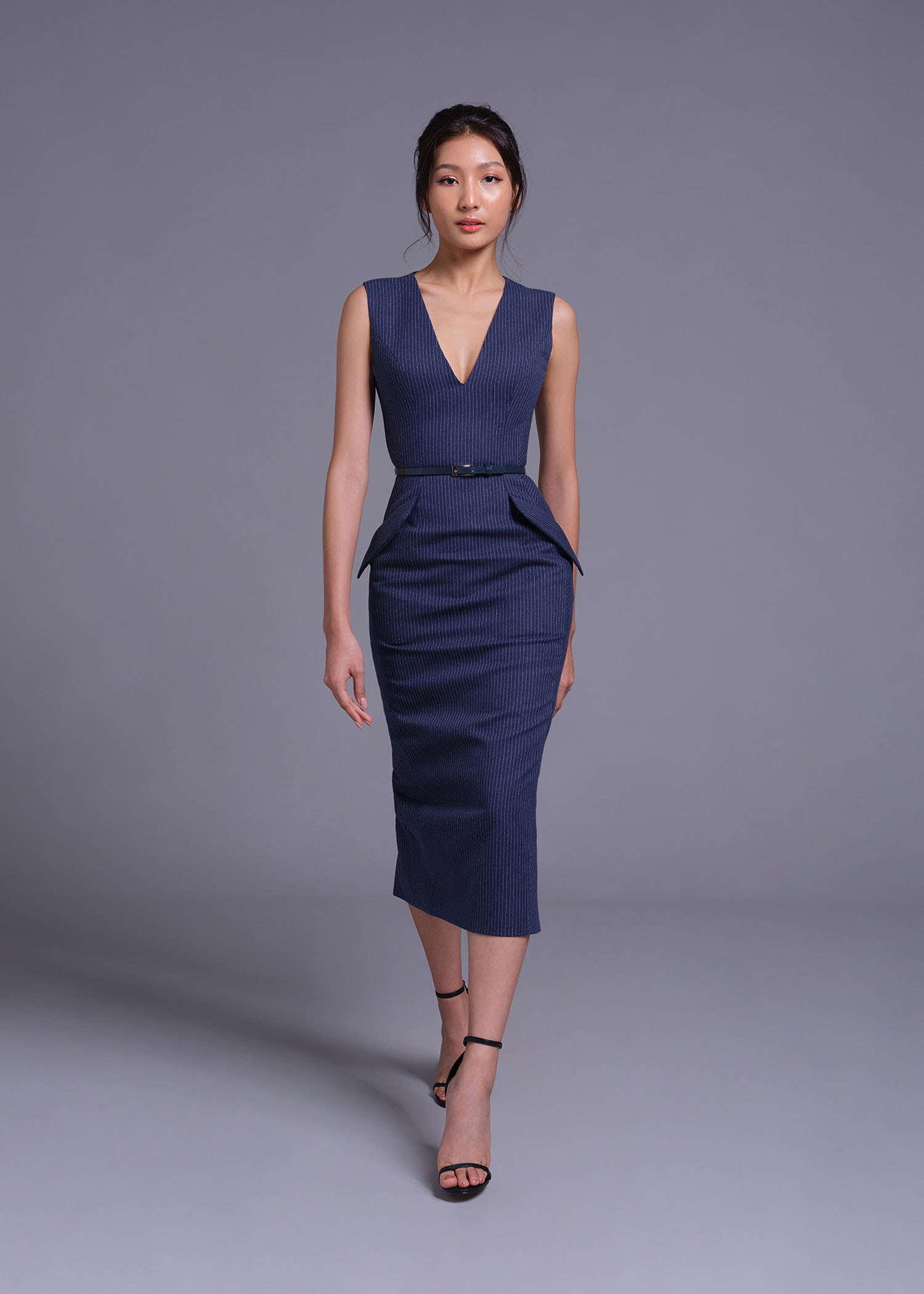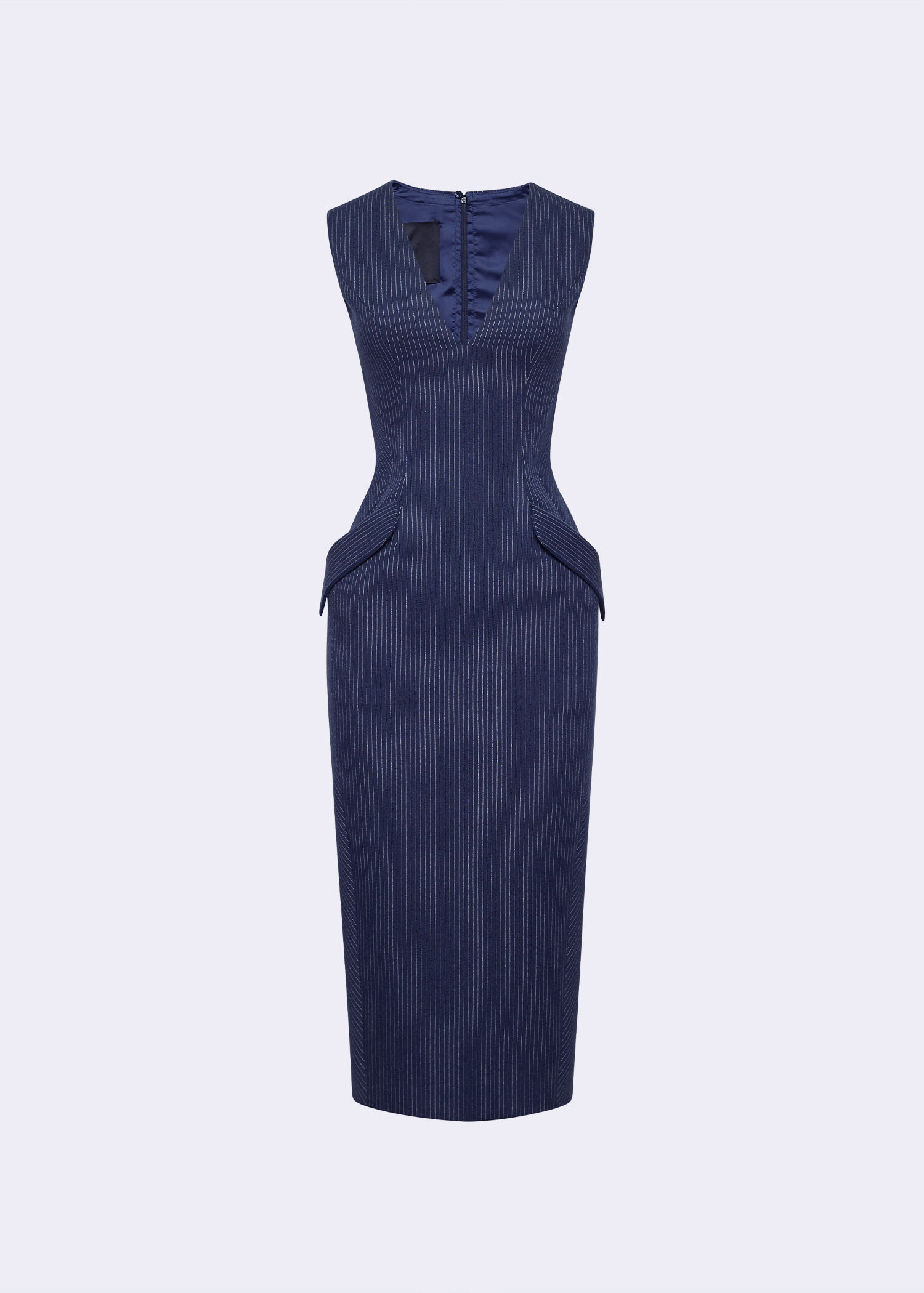 This navy pinstripe sheath dress, a perfect blend of sophistication and modern tailoring. Crafted from high-quality cotton, this dress offers breathability and comfort while maintaining a structured silhouette. The classic pinstripe pattern enhances its professional appeal, making it ideal for office wear, business meetings, and formal events. The sheath cut flatters the figure, ensuring a sleek and elegant look. Pair it with heels and a blazer for a polished ensemble or style it with minimal accessories for a refined, effortless outfit.