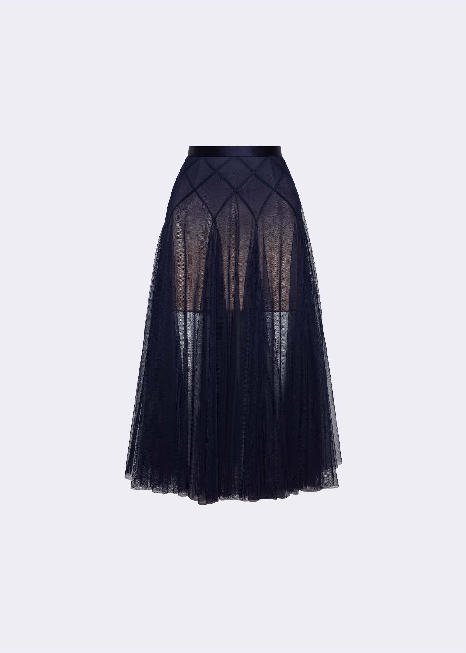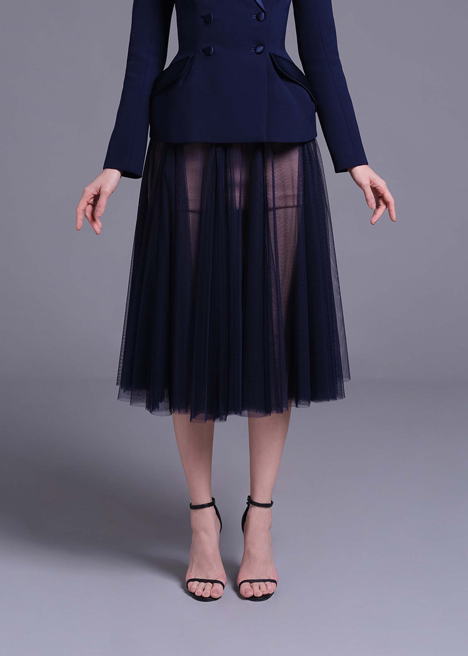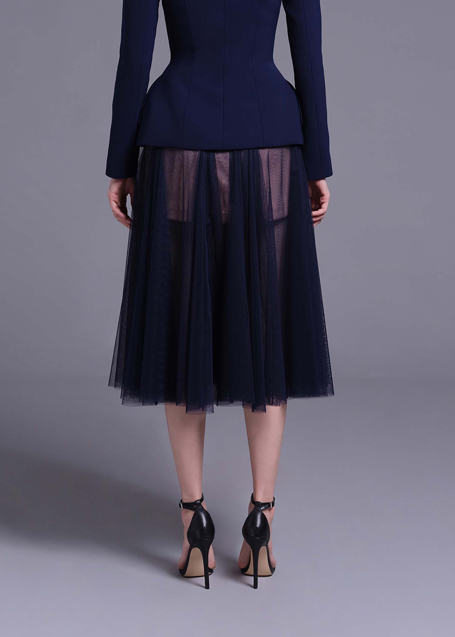 The navy soft net skirt featuring a delicate nude ombre lining and a unique double-layer intertwine-cut design. The soft net fabric adds an ethereal feel, while the ombre effect offers a striking contrast that blends seamlessly with the navy hue. The double-layer design adds depth and movement, making it perfect for evening events, formal occasions, or chic outings. This skirt combines contemporary style with timeless beauty, providing a show-stopping piece for your wardrobe.