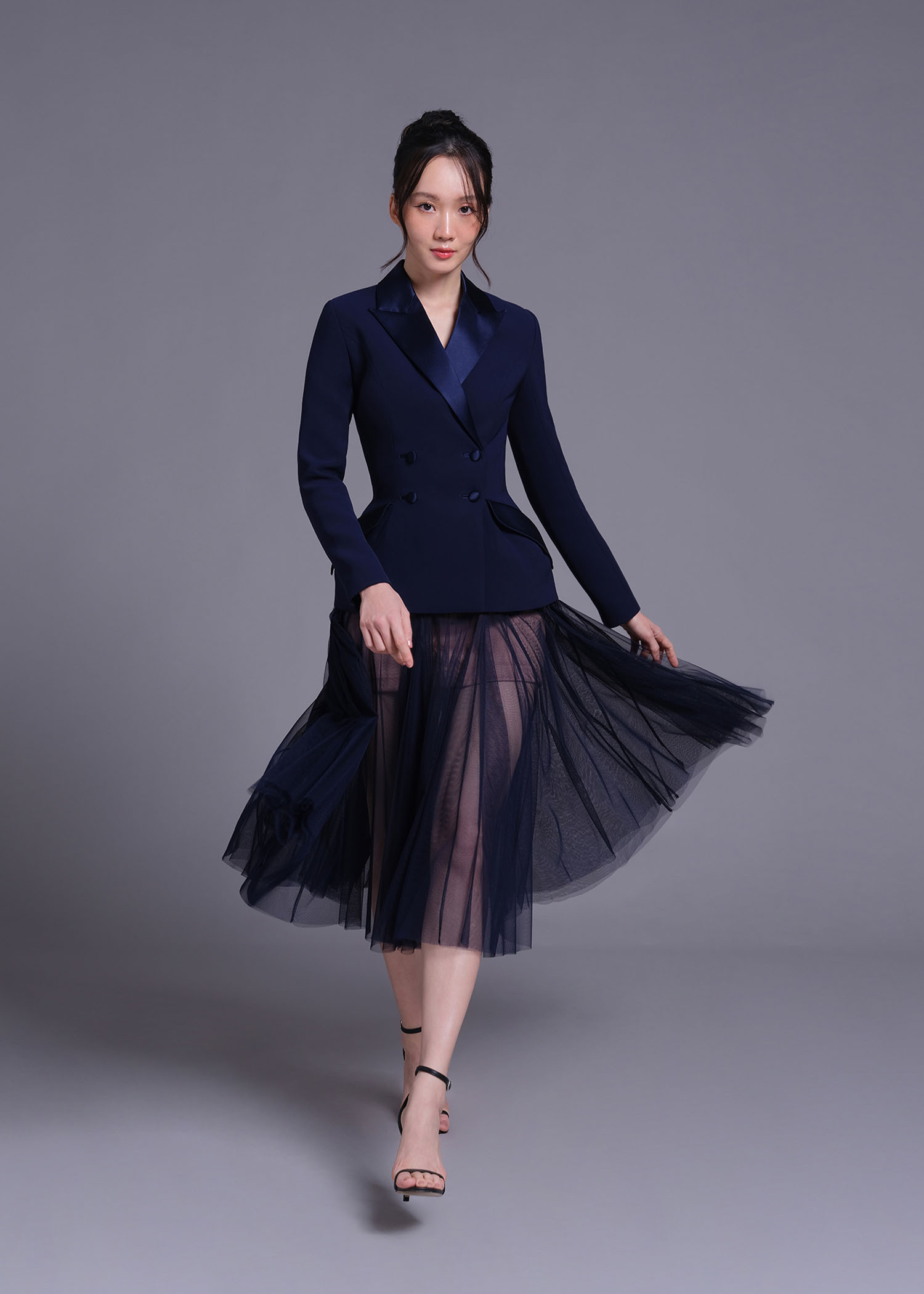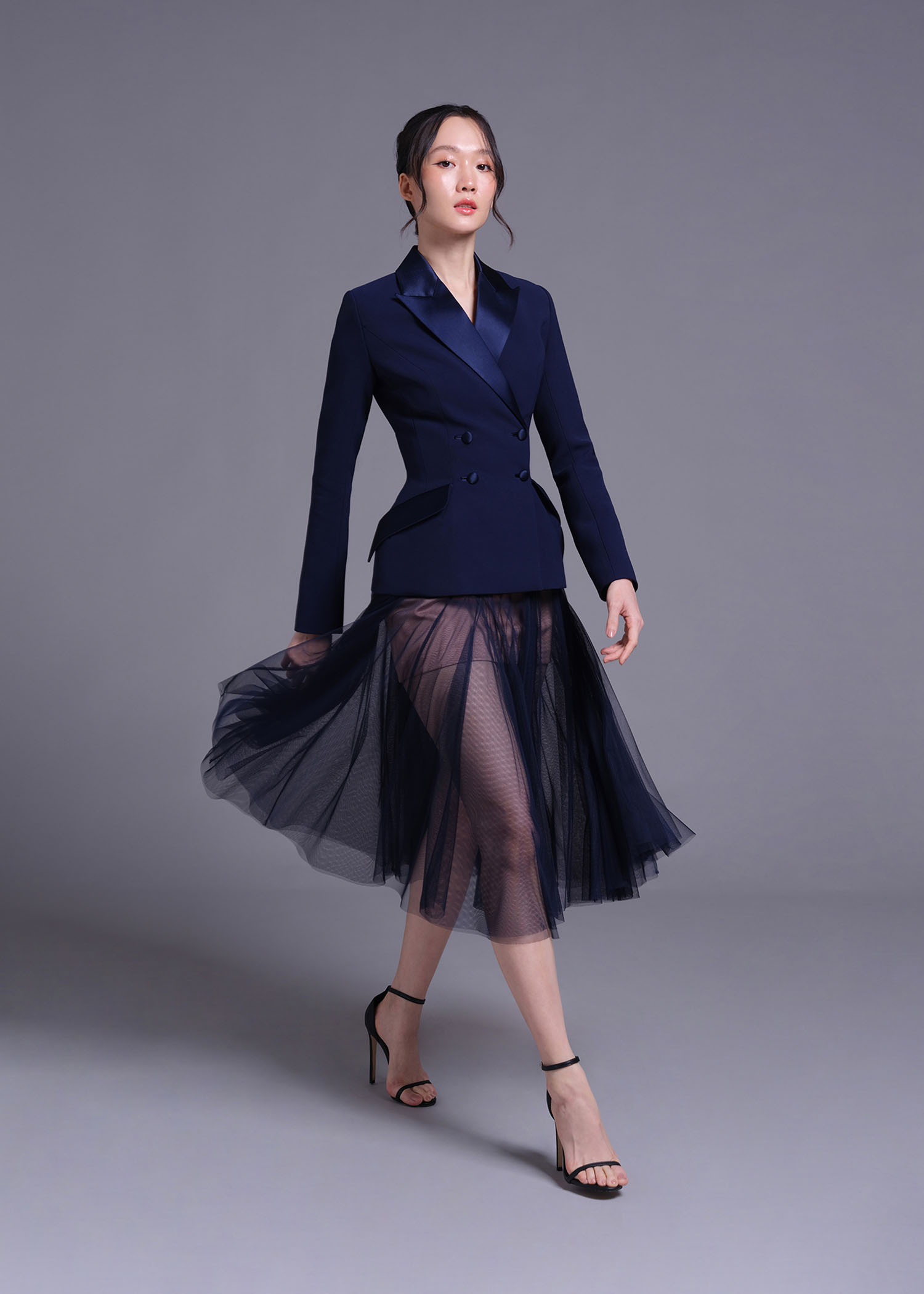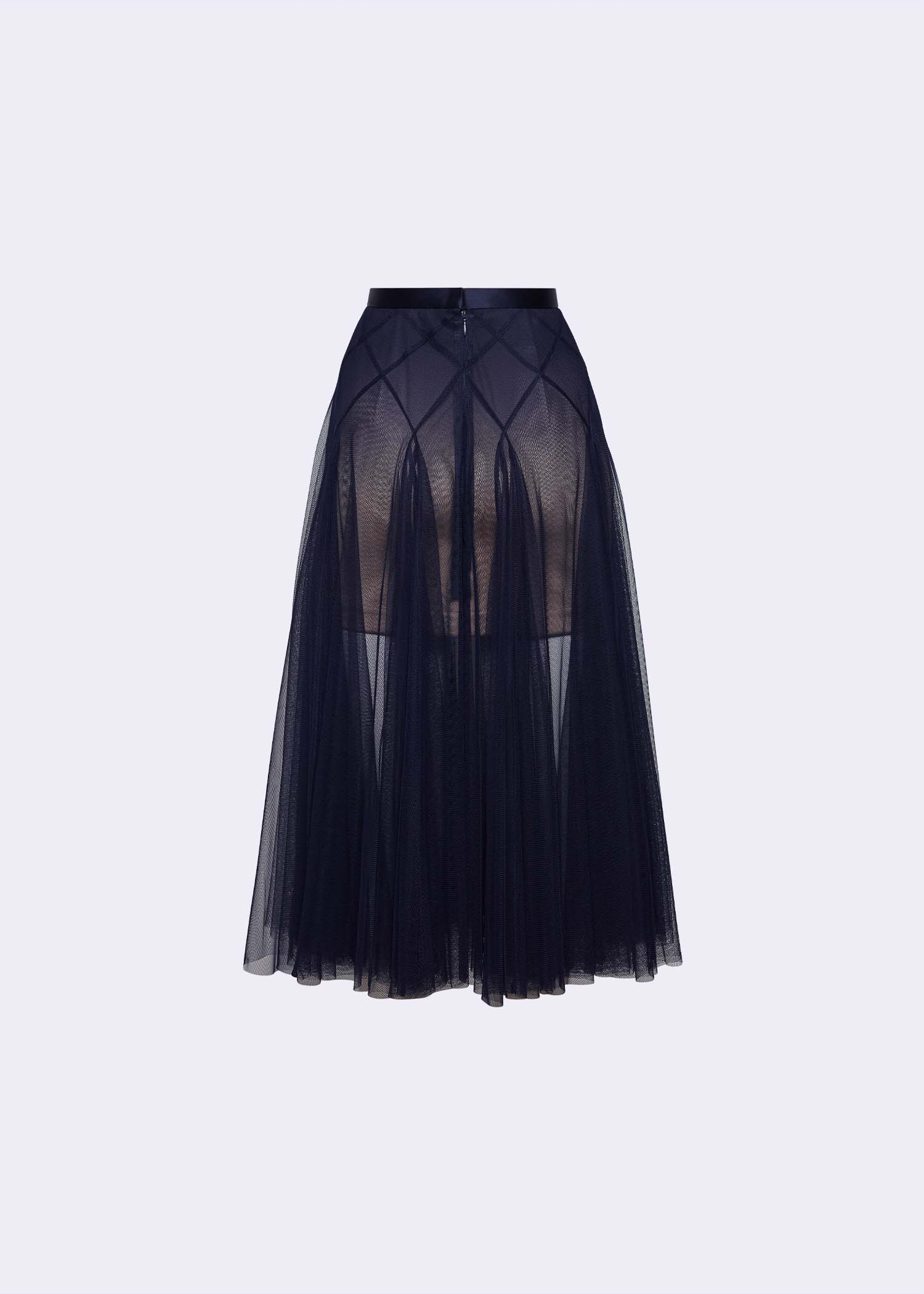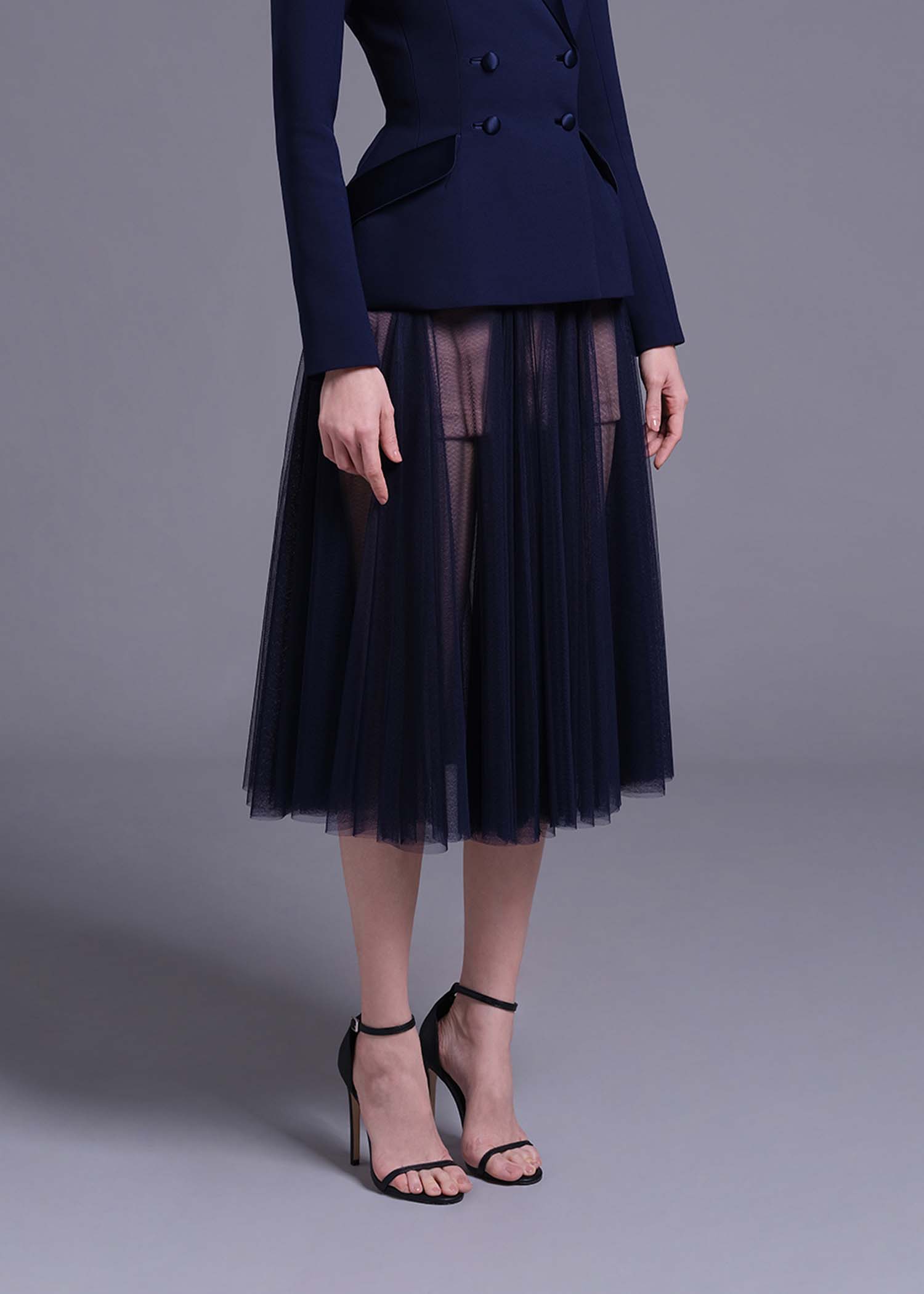 The navy soft net skirt featuring a delicate nude ombre lining and a unique double-layer intertwine-cut design. The soft net fabric adds an ethereal feel, while the ombre effect offers a striking contrast that blends seamlessly with the navy hue. The double-layer design adds depth and movement, making it perfect for evening events, formal occasions, or chic outings. This skirt combines contemporary style with timeless beauty, providing a show-stopping piece for your wardrobe.