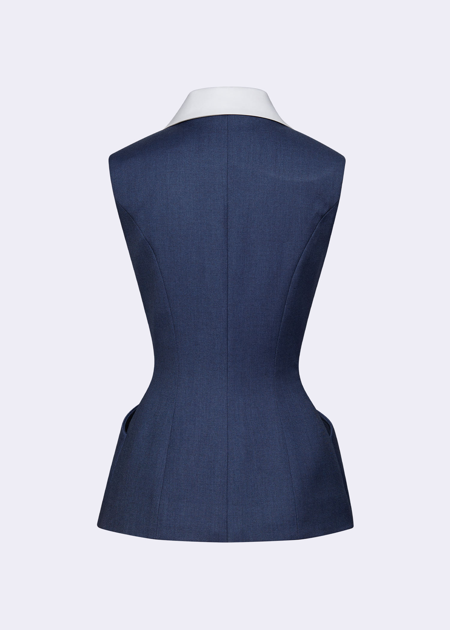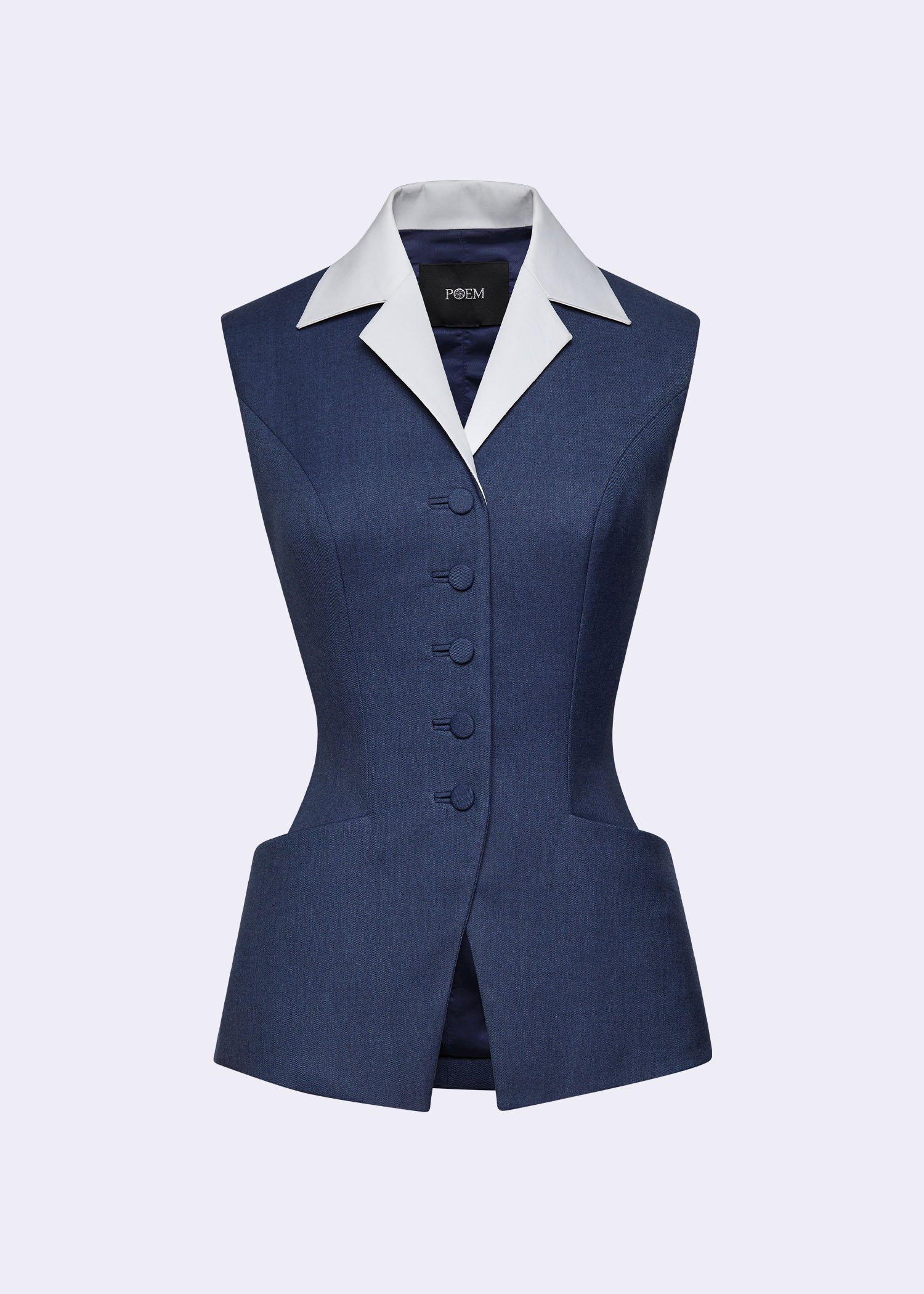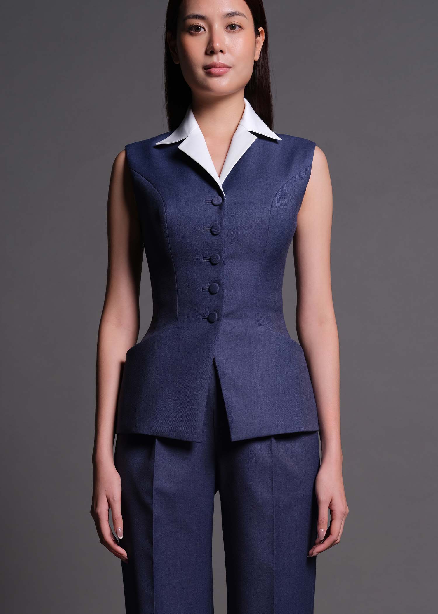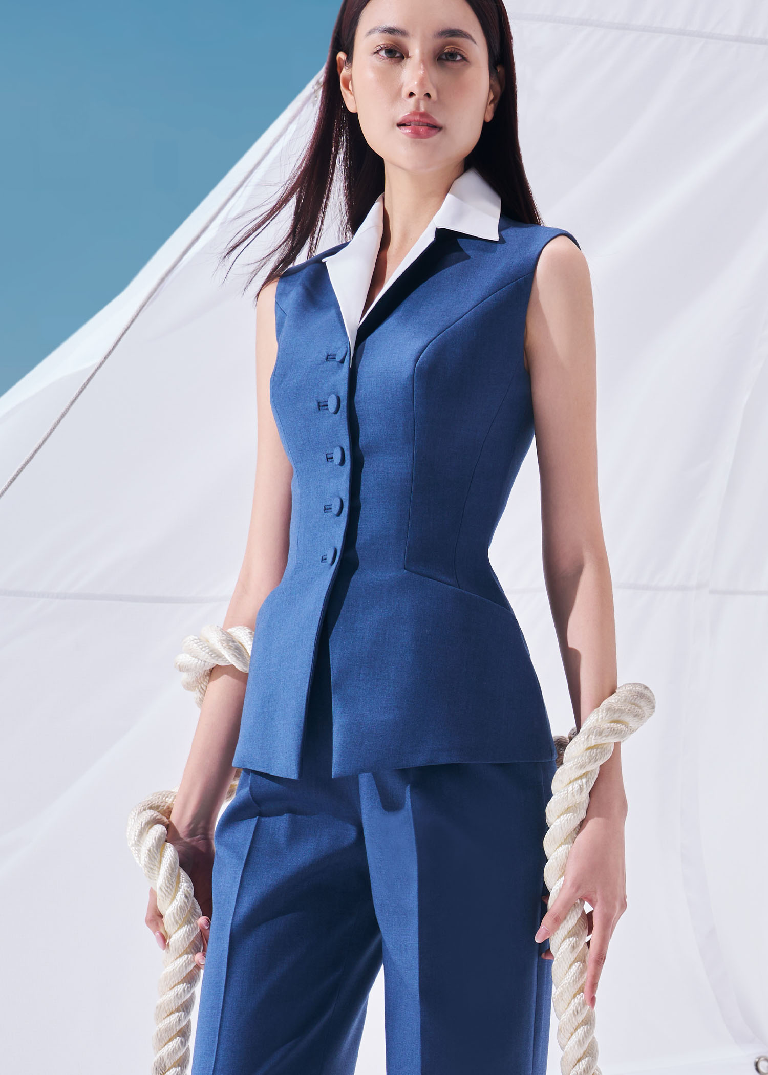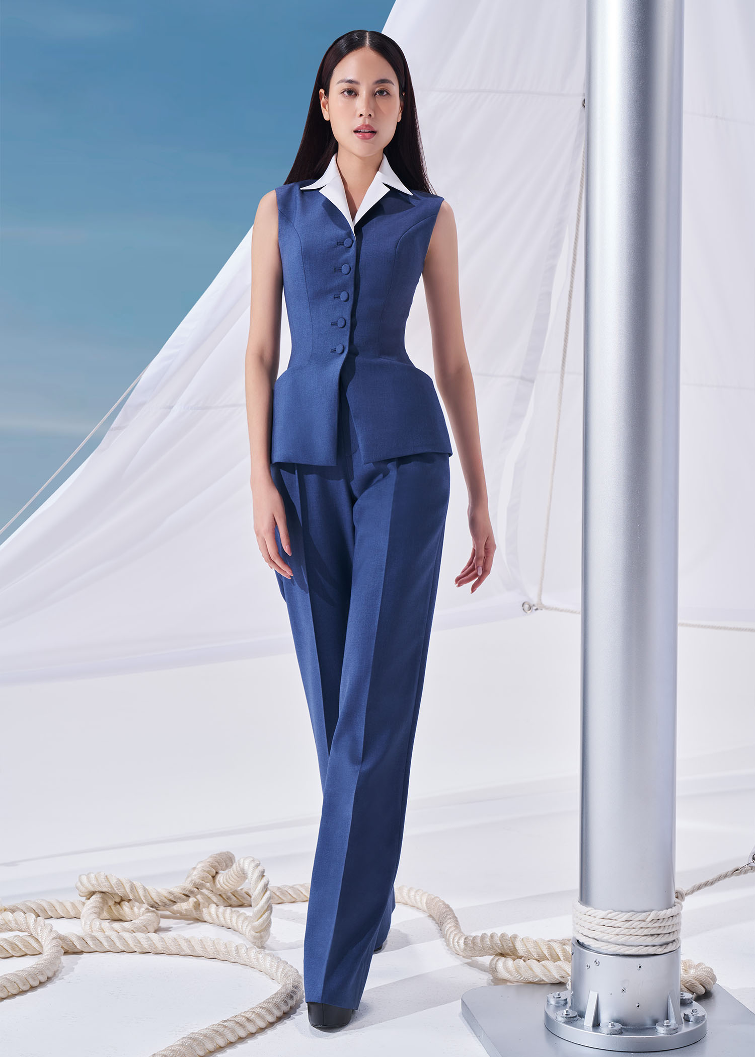 Part of the Cruise 2026 “Nautica Femme” Collection, this navy tailored blouse reinterprets classic sailor tailoring through a modern, feminine silhouette. The structured design is elevated by a crisp off-white collar, offering a subtle nautical contrast that reflects the spirit of freedom and refined confidence. Crafted from smooth polyester, the blouse contours the body with clean lines and thoughtful construction, balancing elegance with everyday wearability. Designed for women who move effortlessly between destinations, this piece embodies the harmony between timeless maritime heritage and contemporary sophistication.