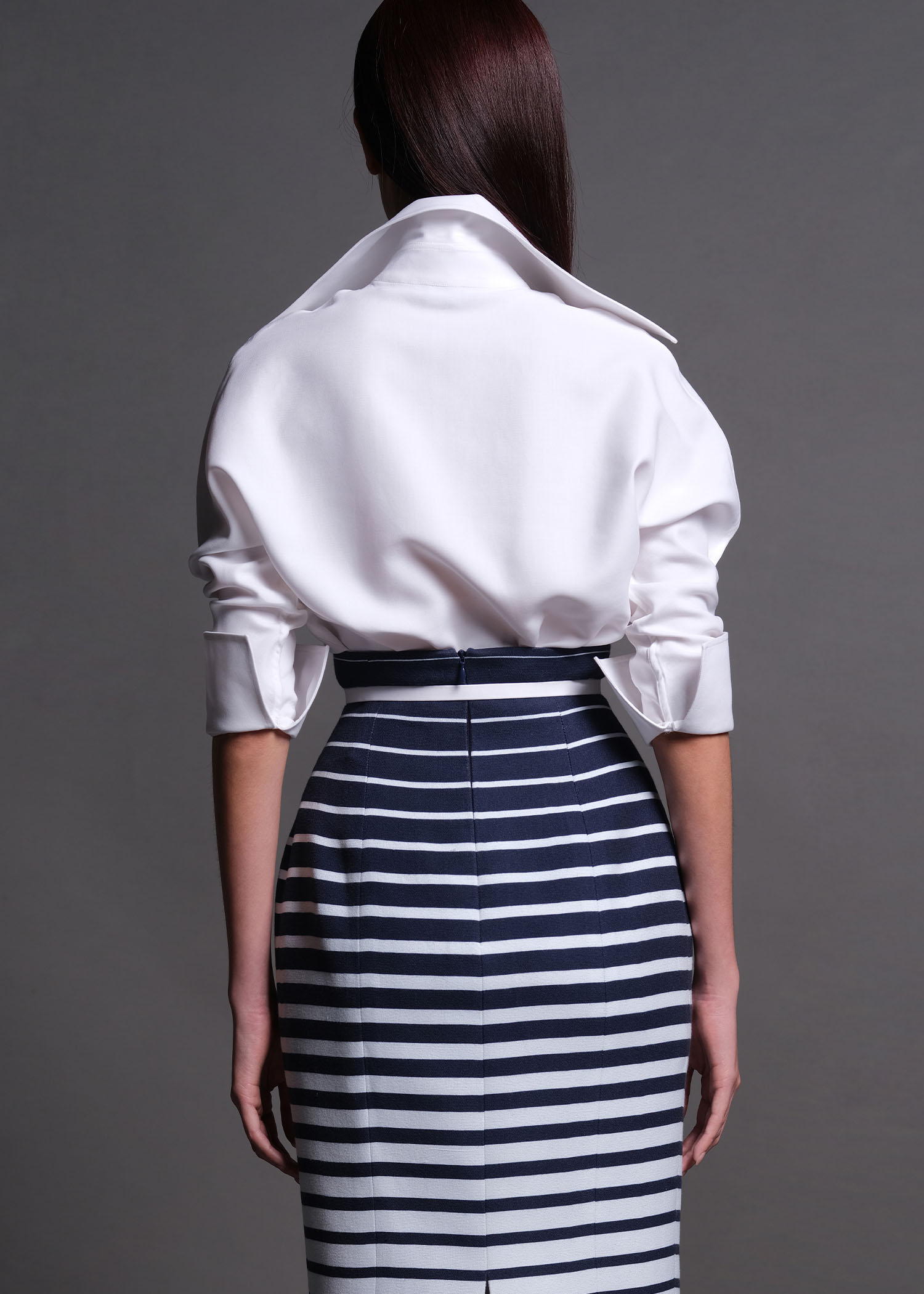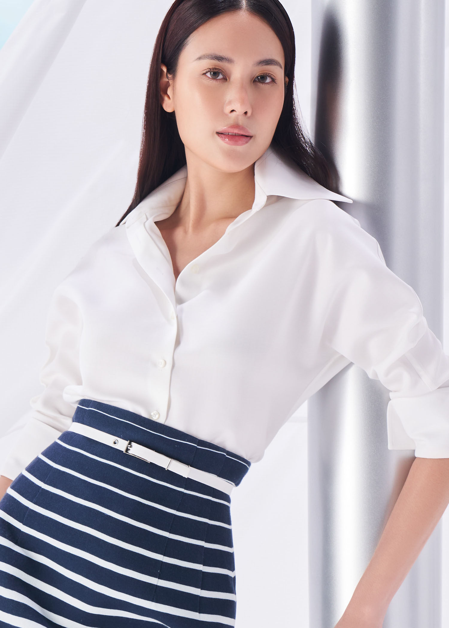 This off-white cotton shirt is a modern interpretation of a timeless classic. Crafted from premium cotton, it offers a smooth, breathable feel with a structured yet comfortable fit. The clean button-down front and sharp collar create a polished silhouette, making it an effortless staple for both professional and refined casual looks. Designed to transition seamlessly from office wear to evening styling, this shirt pairs perfectly with tailored skirts, trousers, or denim for an understated, sophisticated aesthetic.