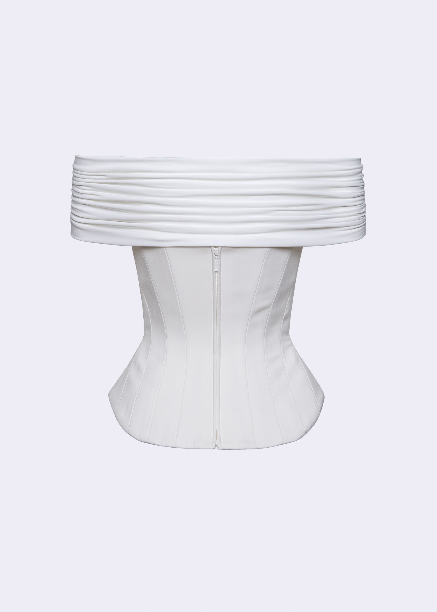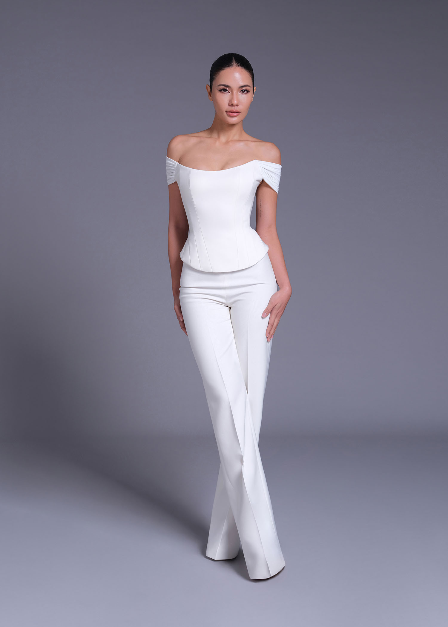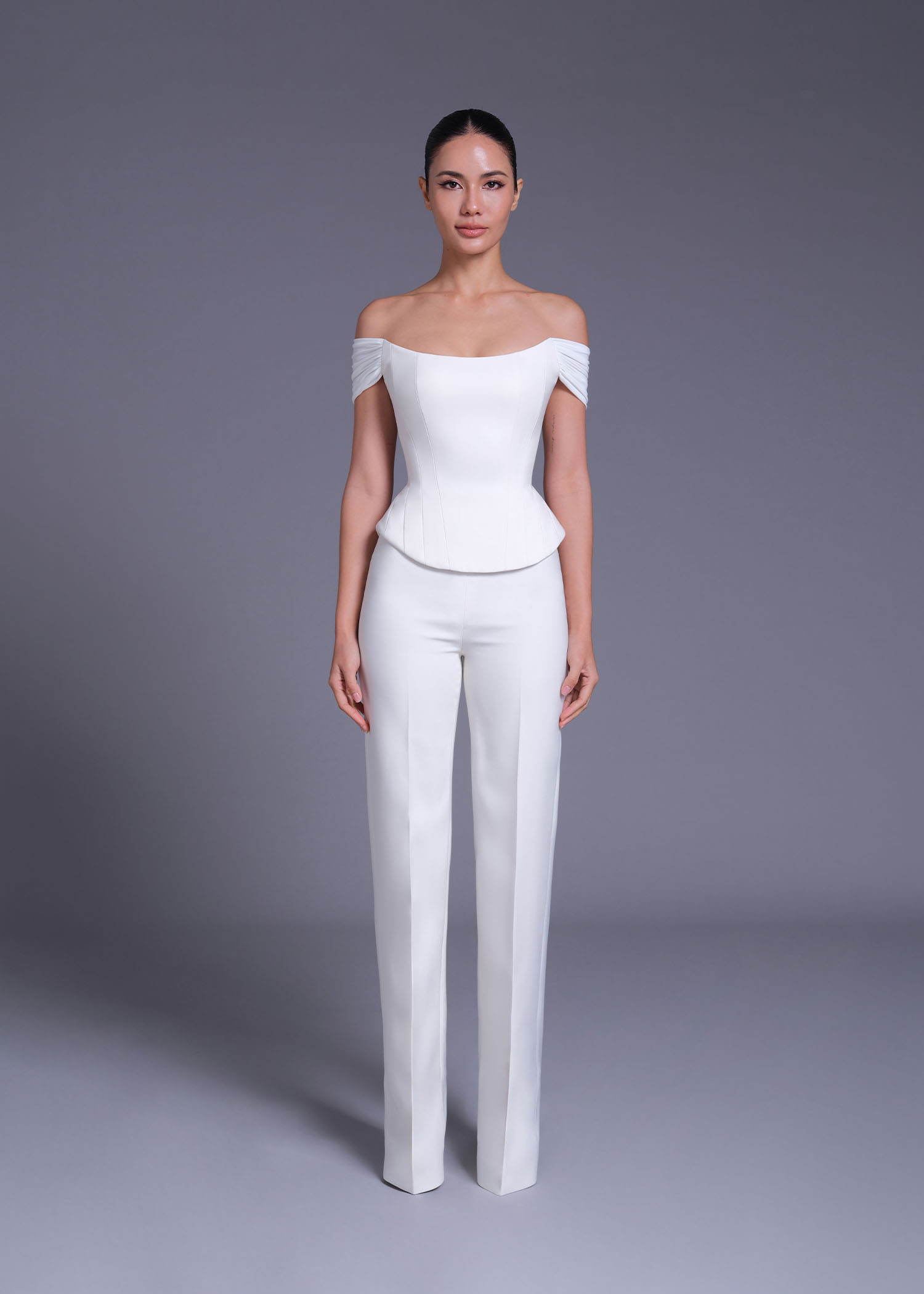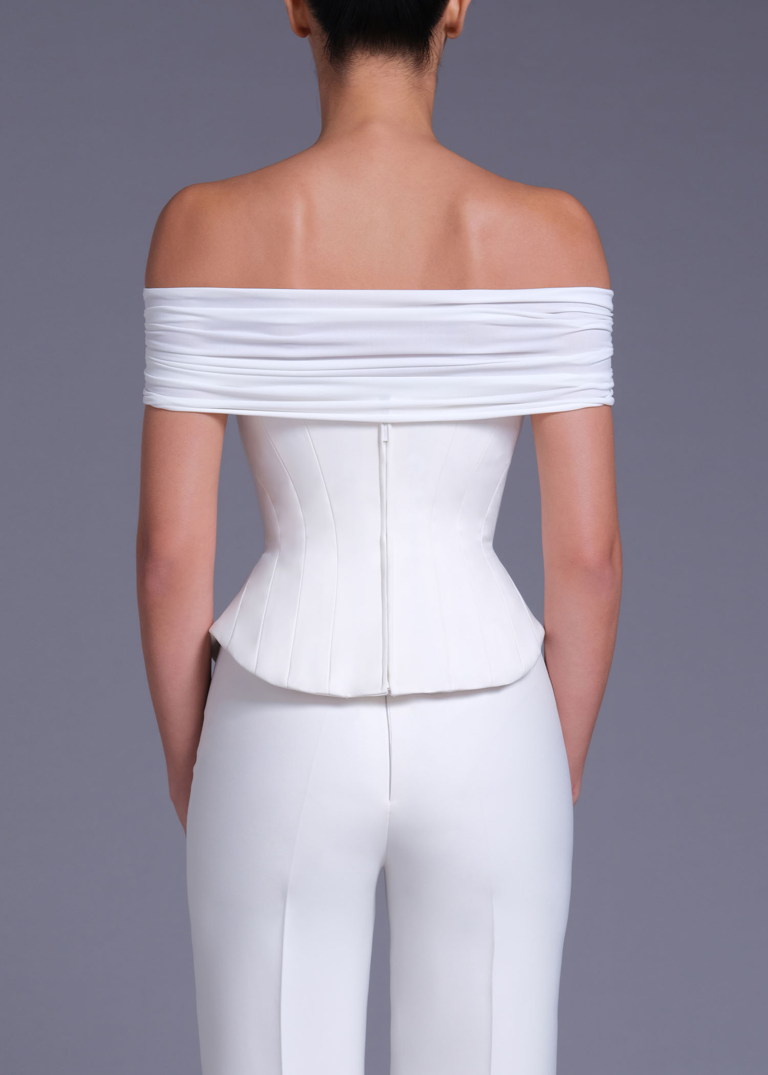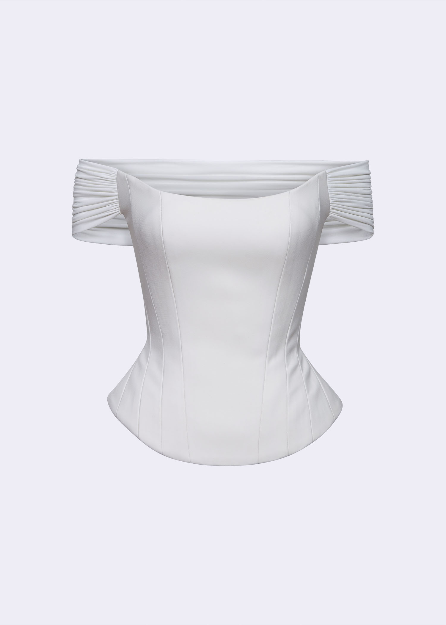 The Off-white “Fragonard” off-shoulder corset top. Crafted from premium polyester, this structured design highlights the waist with a flattering corset-inspired fit while showcasing delicately draped off-shoulder sleeves. The off-white shade enhances its timeless sophistication, making it an ideal choice for evening occasions, modern bridal wear, or pairing with tailored trousers for a polished daytime look. Combining classic femininity with contemporary tailoring, this blouse is a versatile statement piece for the elegant wardrobe.