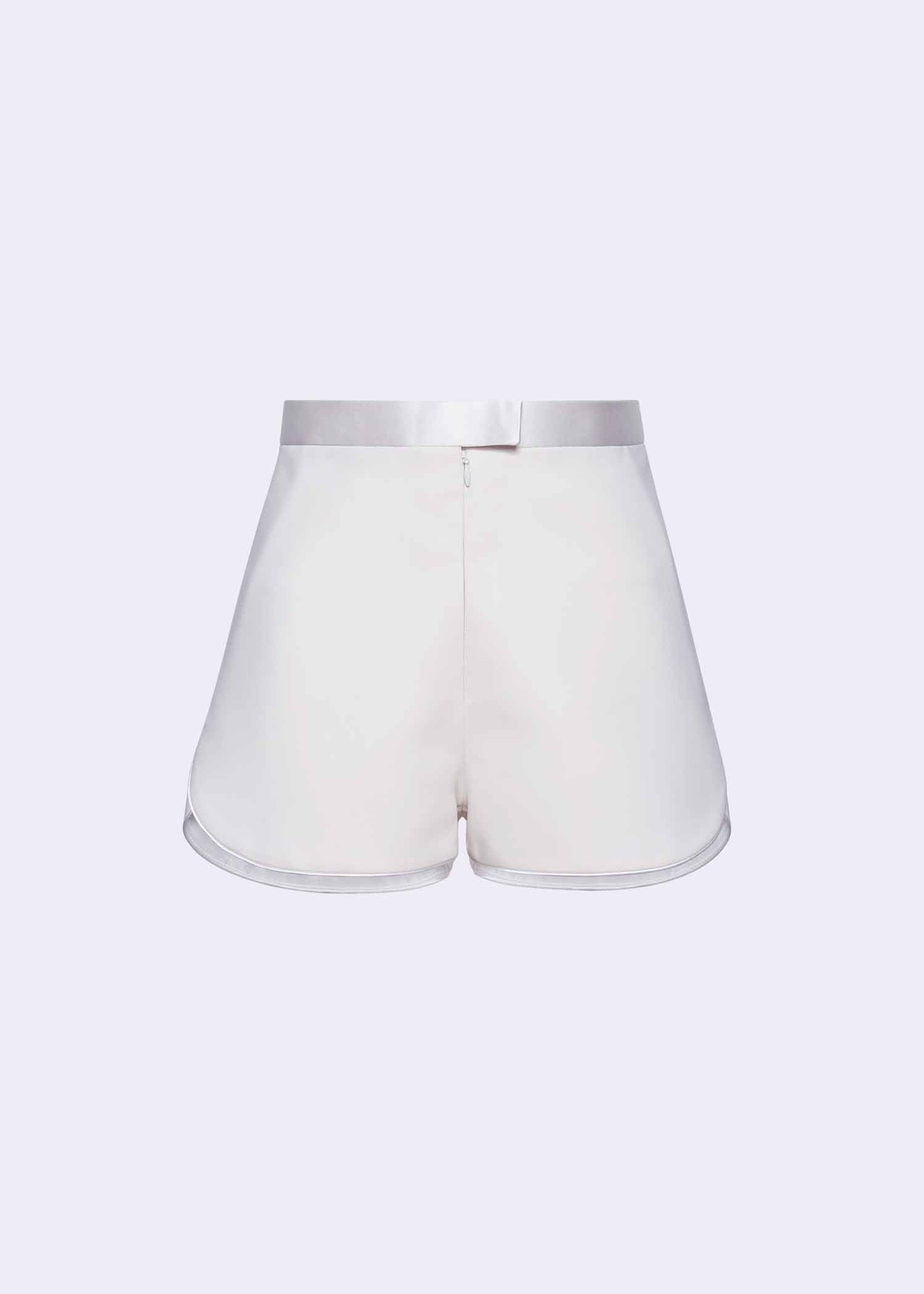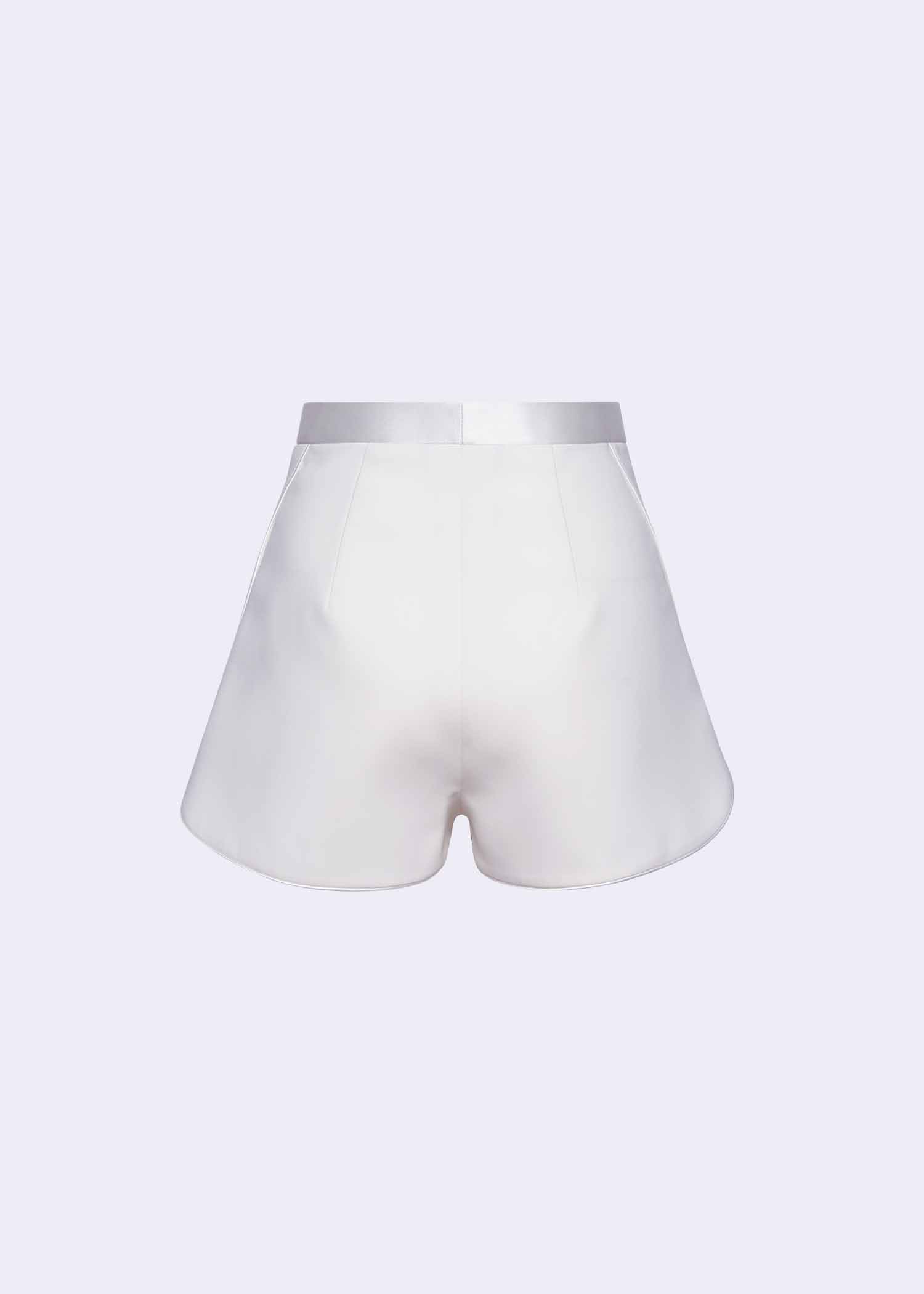 Our off-white polyester high-waist shorts, designed with a luxurious satin-crepe waistband for an added touch of elegance. These shorts offer a sleek, tailored look that’s perfect for both casual and formal settings. The high-waist design flatters your silhouette, making them ideal for pairing with crop tops, blouses, or fitted shirts. Whether you’re dressing up for an evening out or keeping it chic during the day, these shorts provide the versatility you need in your wardrobe. The polyester fabric ensures comfort and durability, while the satin-crepe waistband adds