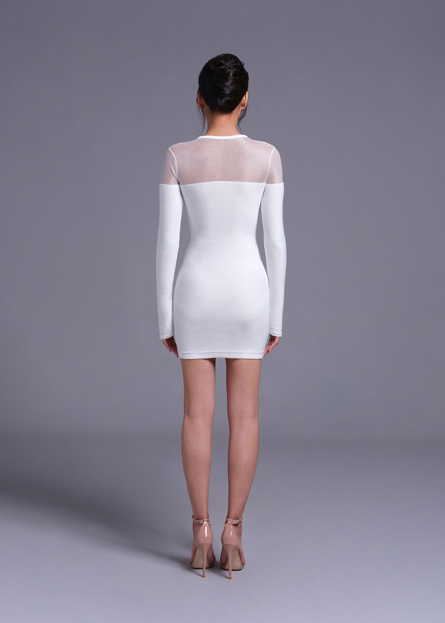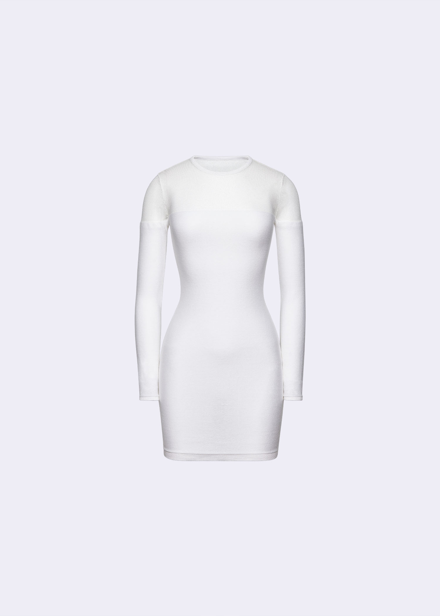 The Off-White Mini Knit Dress. This lightweight, breathable dress features a sheer knit design that exudes elegance and contemporary charm. Perfect for layering or wearing solo, it’s a versatile piece that adapts to any occasion. The soft cotton-viscose blend ensures all-day comfort, while the off-white hue adds a timeless sophistication to your wardrobe. Style it with strappy sandals for daytime chic or heels and bold jewelry for evening glam.