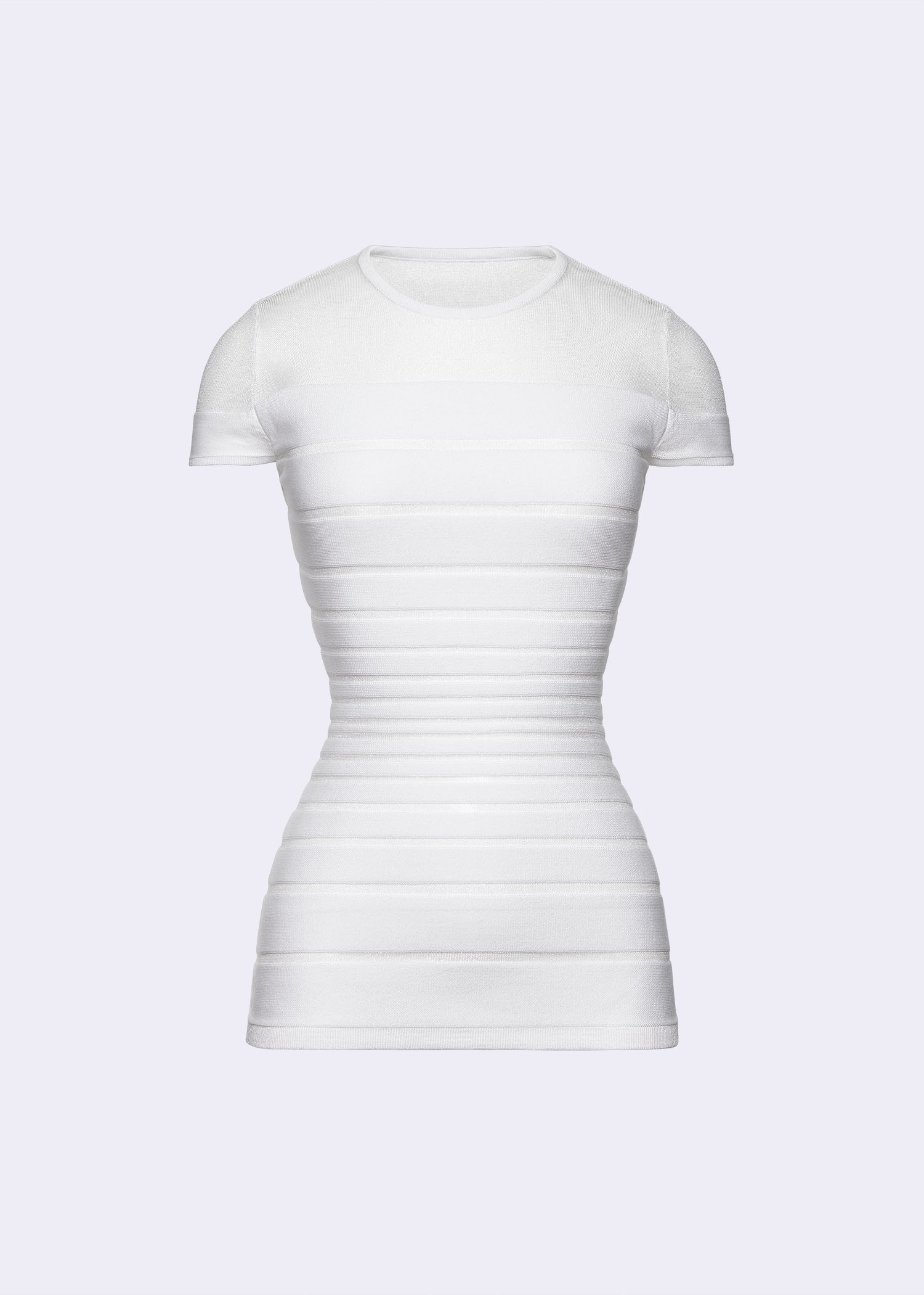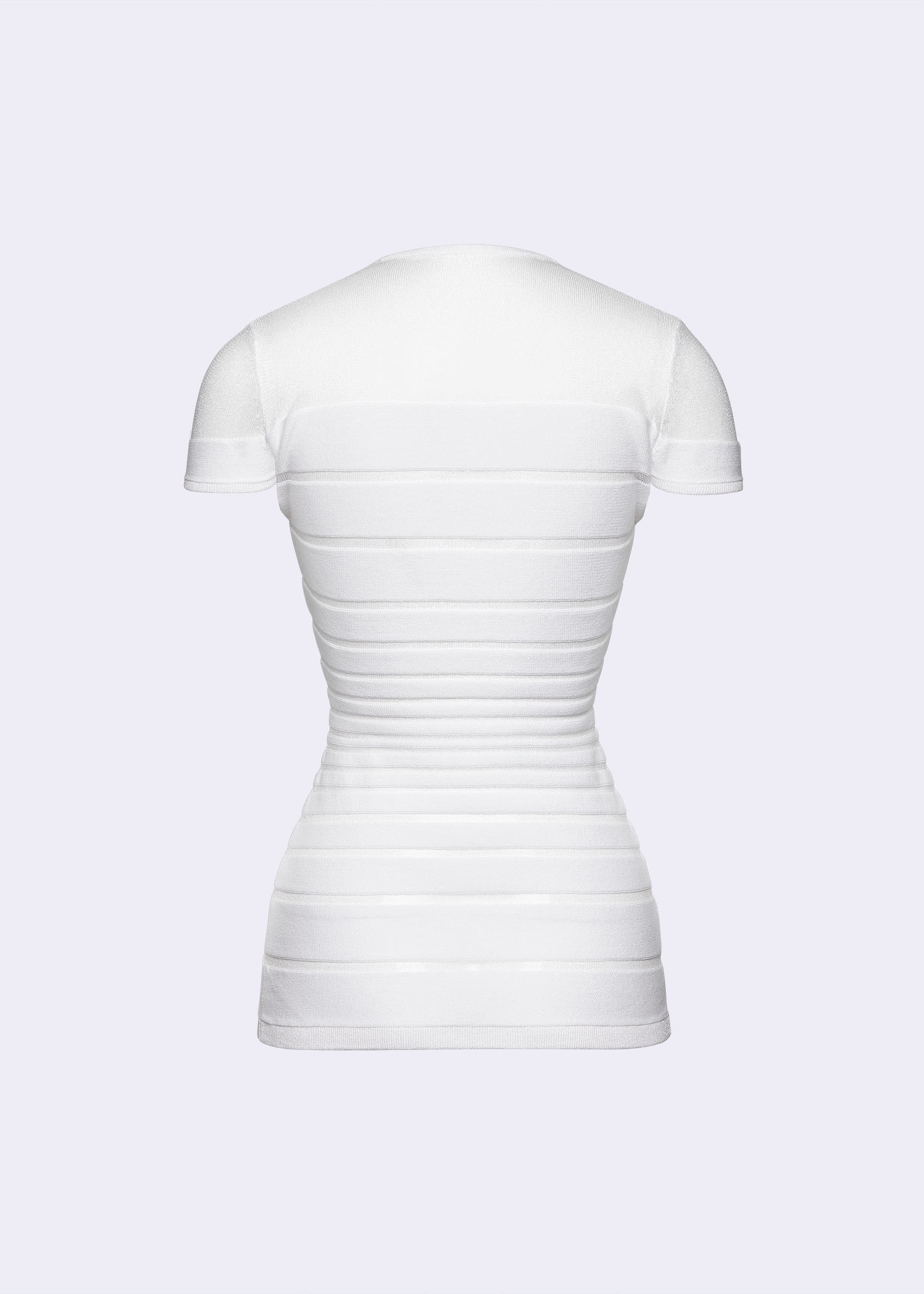 The off-white perspective knit top. Designed with versatility and comfort in mind, this top is made from a premium cotton viscose blend, offering a soft, breathable feel against the skin. Its see-through knit detailing adds a modern and chic touch, making it ideal for layering over camisoles, bralettes, or under tailored blazers for a polished look.