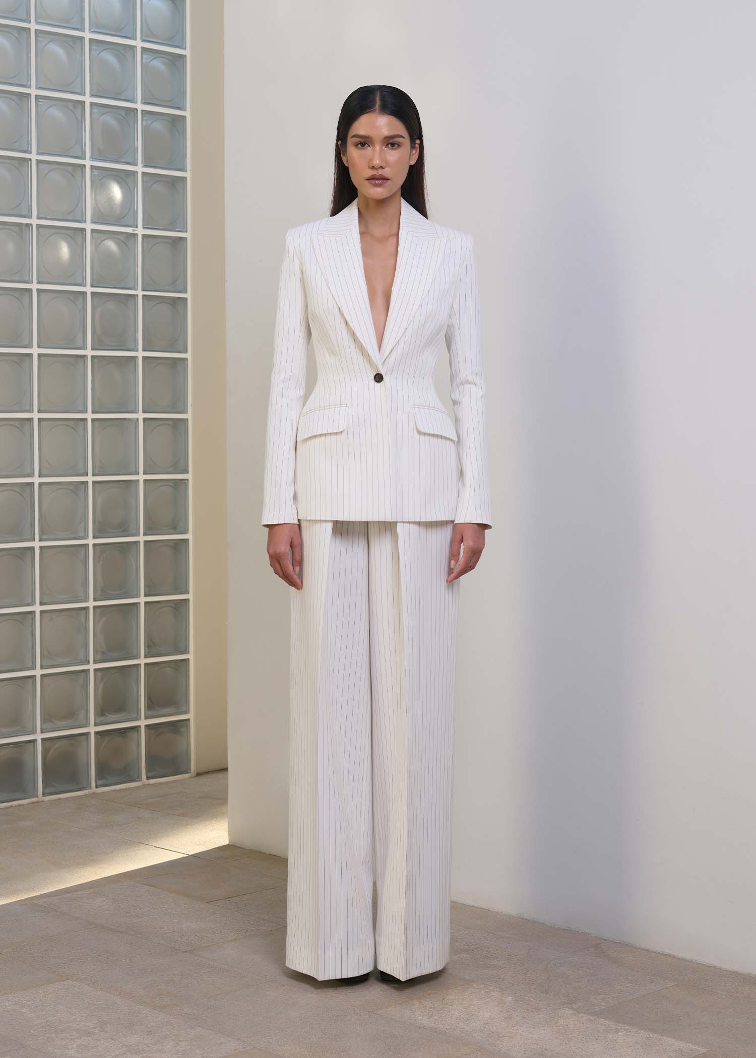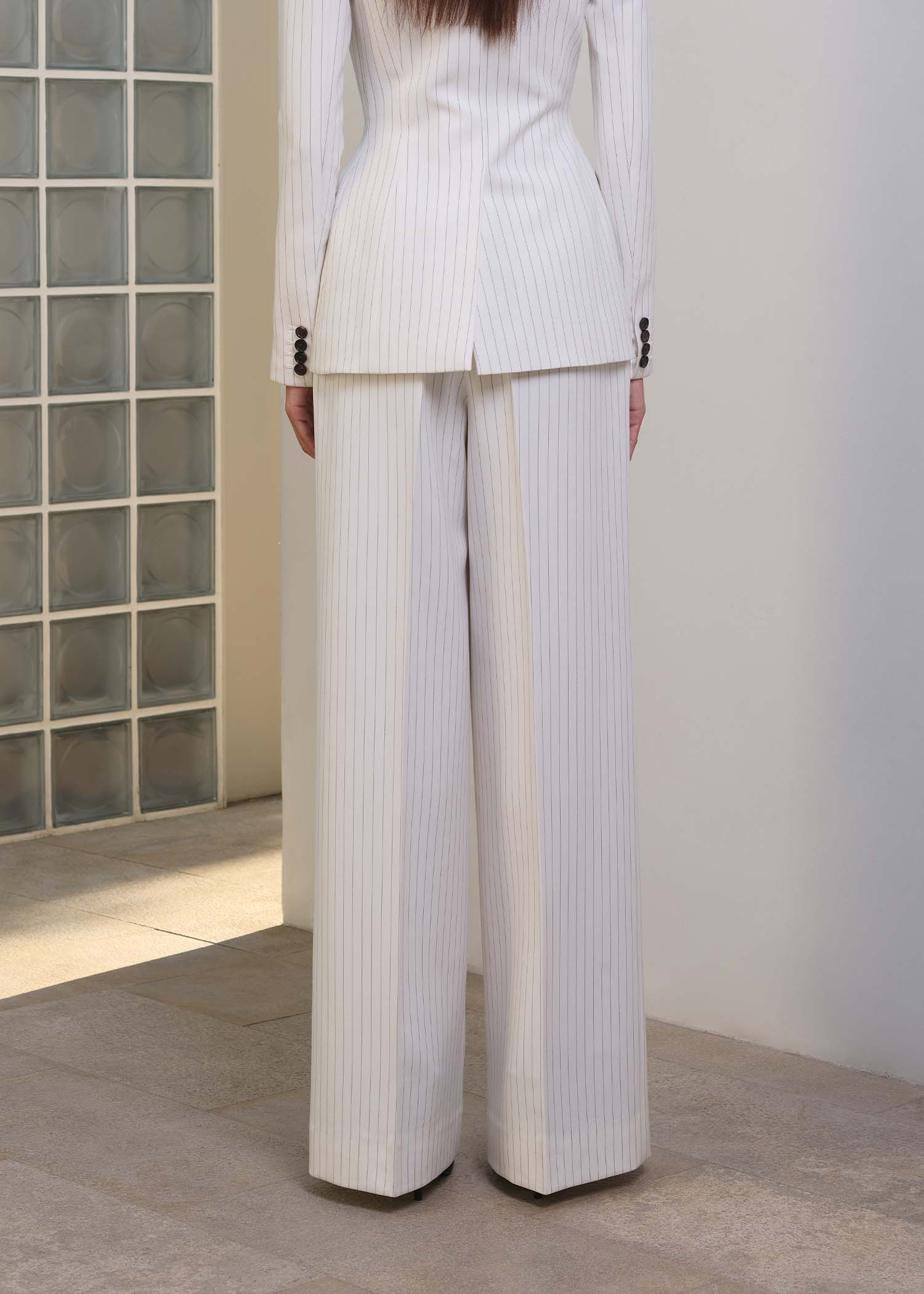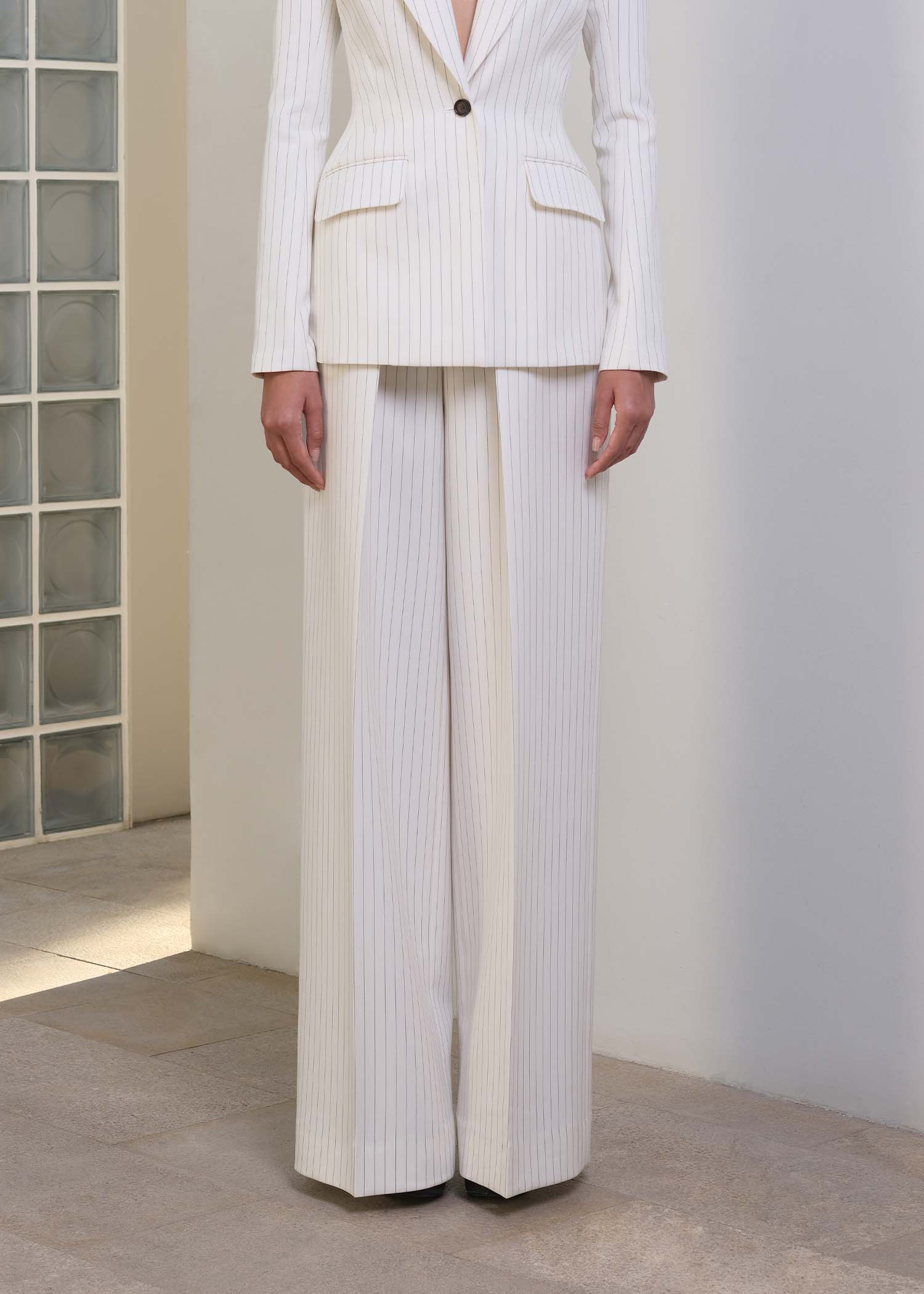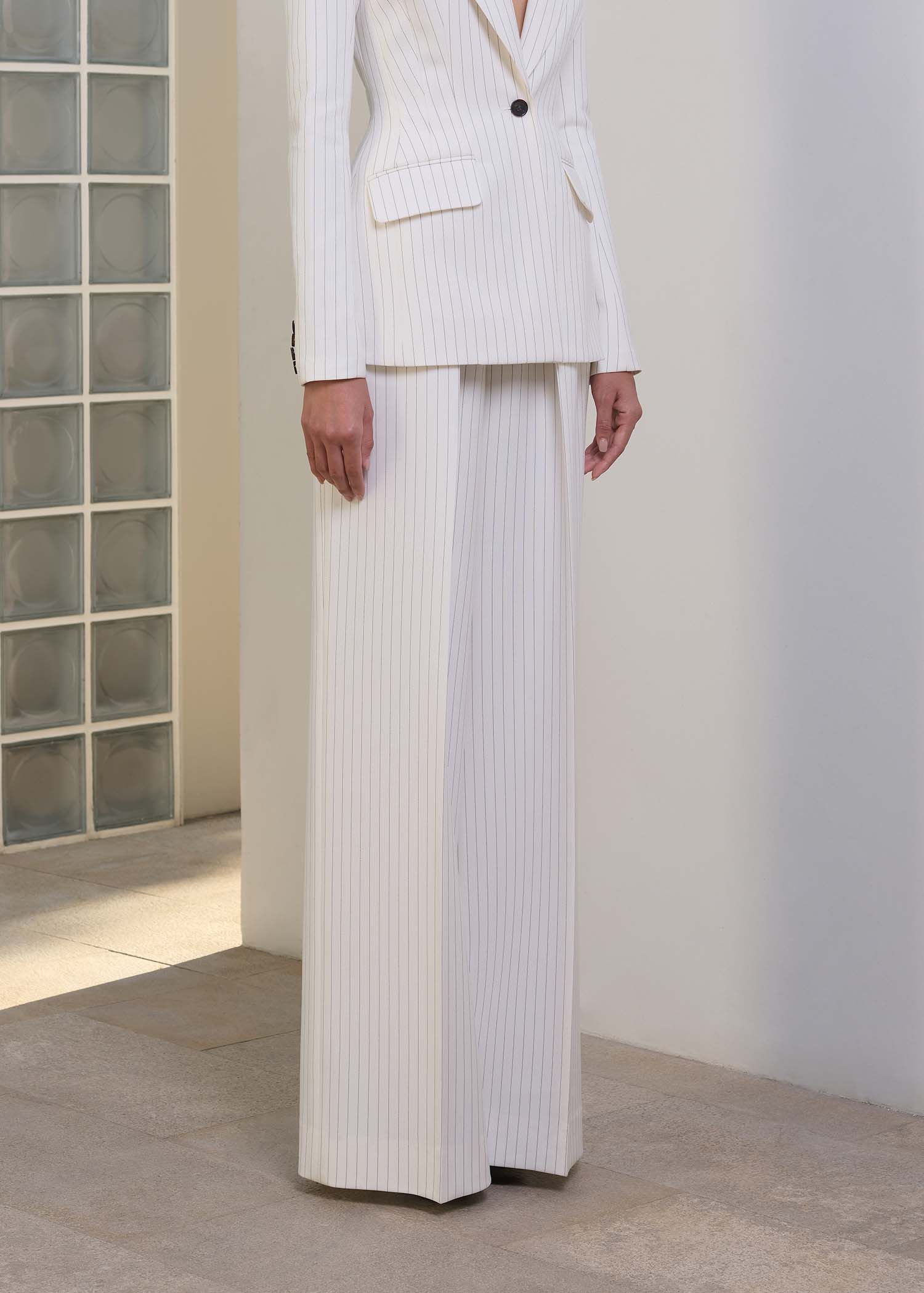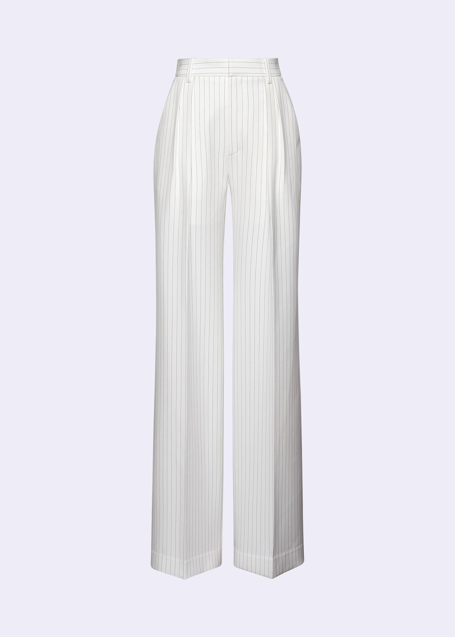 This off-white pinstripe column pants are a standout piece for transitional dressing. Crafted from a breathable cotton-rayon blend, these pants feature a high-rise waist and elongated column silhouette that flatters and lengthens the figure. The subtle pinstripes add depth and dimension, making them the perfect piece for sharp daywear or elevated evening ensembles. Ideal for pairing with tonal tailoring or a structured blouse.