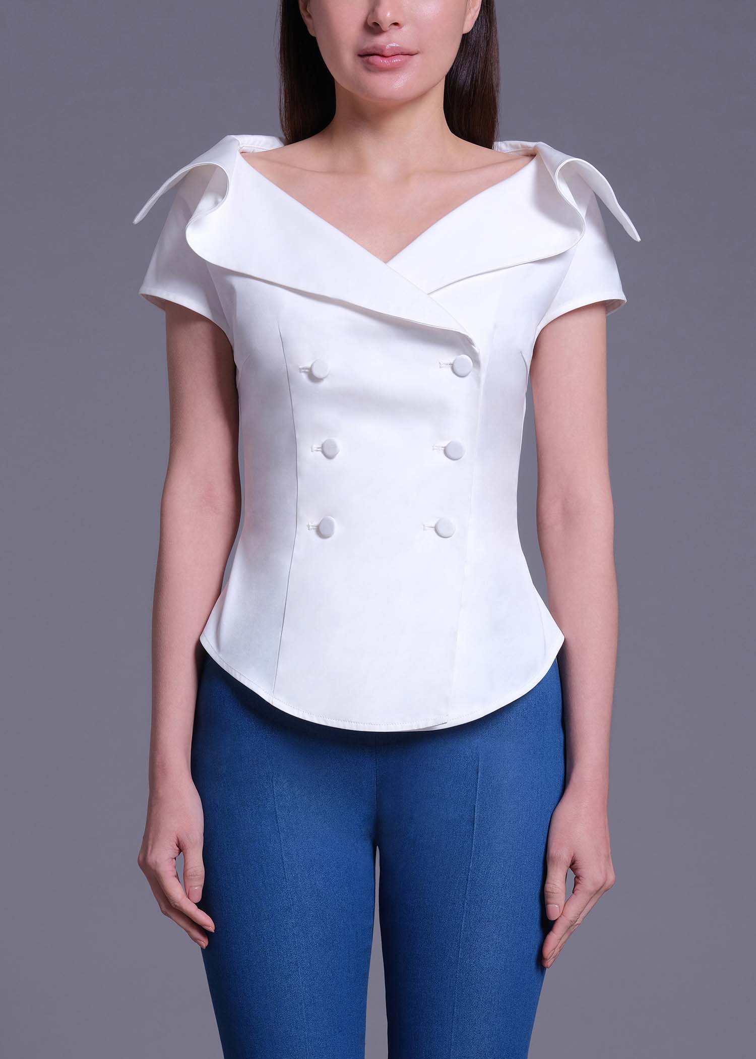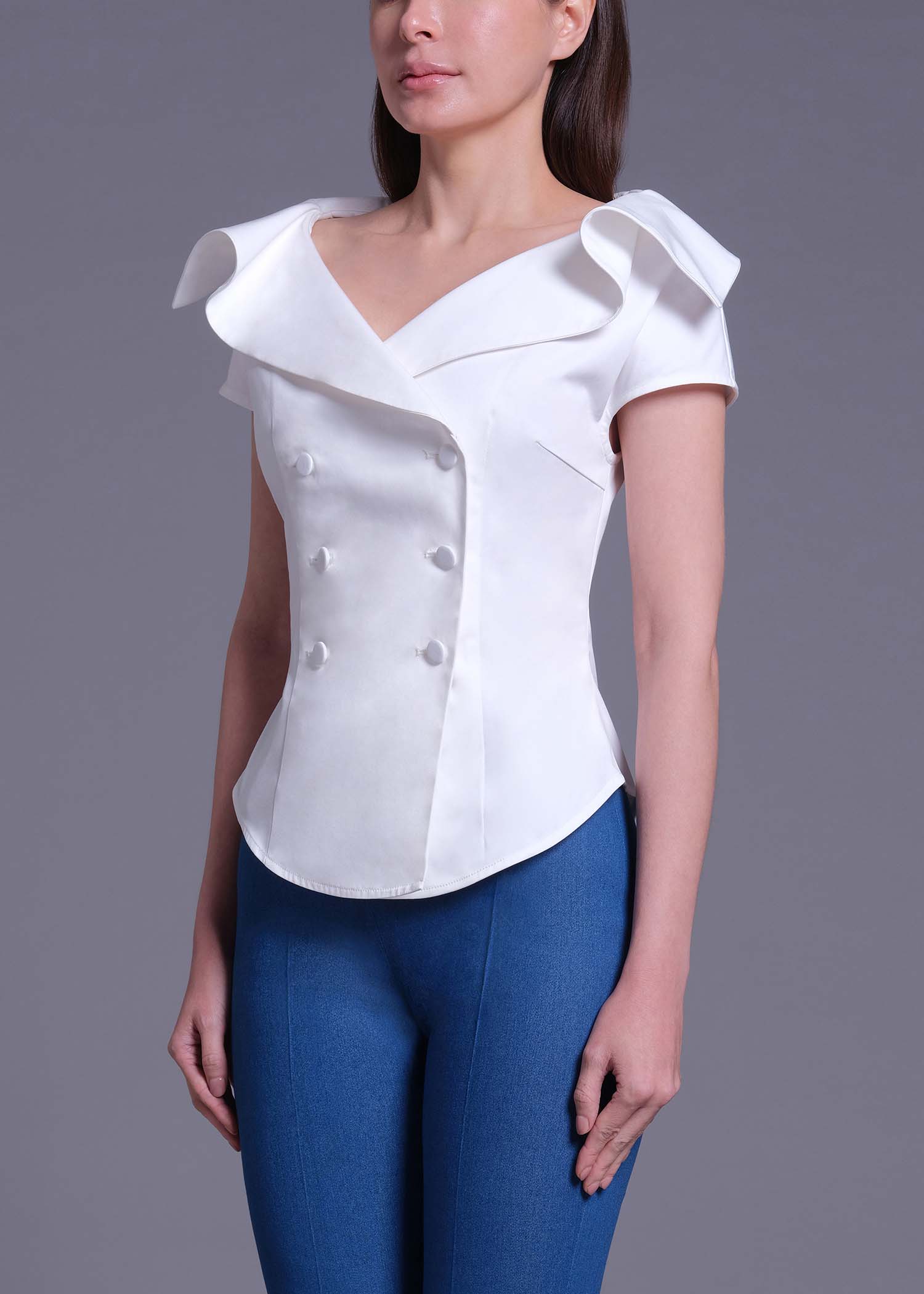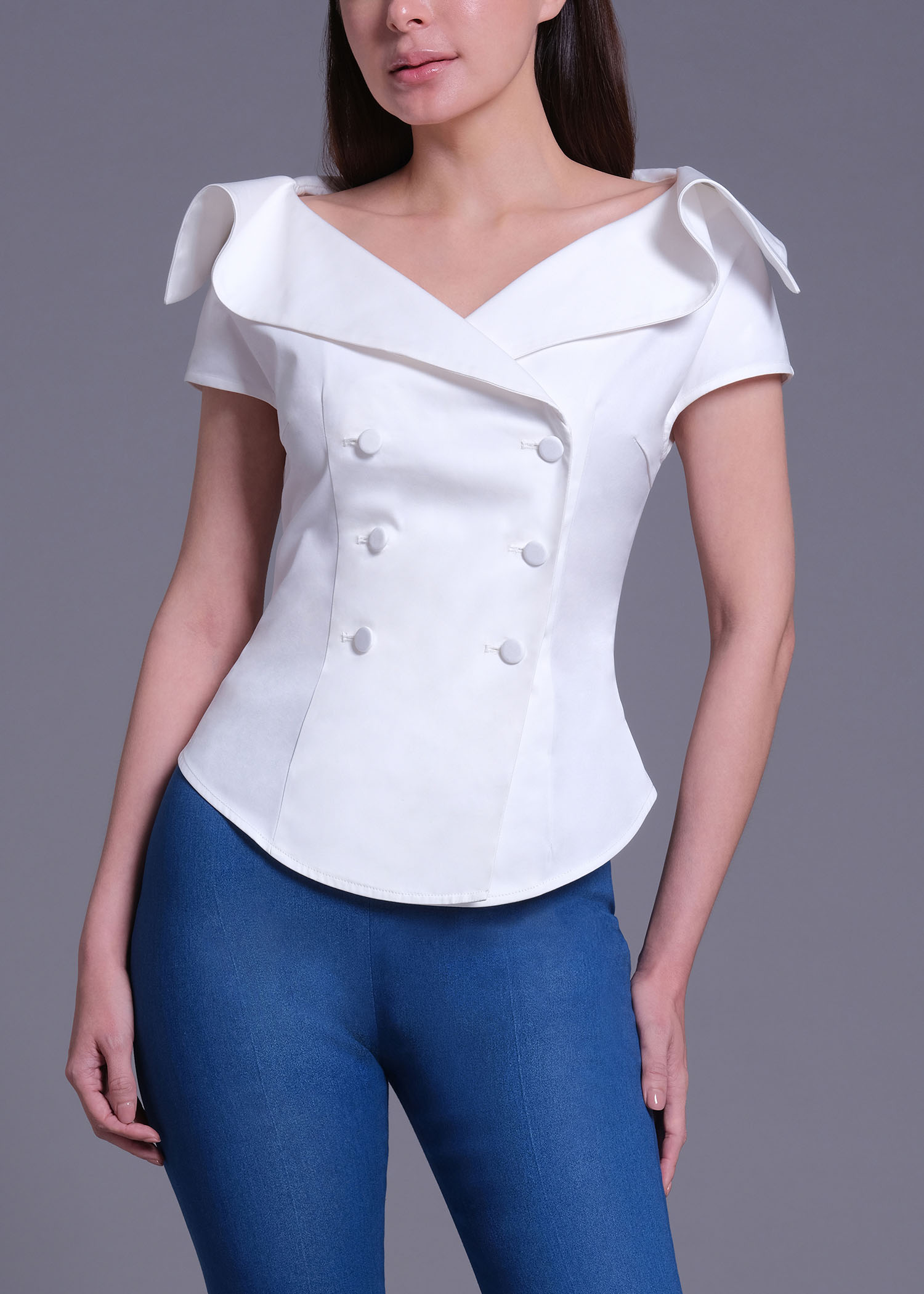 This off-white cotton blouse is tailored in a flattering double-breasted silhouette with a statement wide collar framed by delicate ruffled-shawl detailing. The sculpted waistline and clean finishing create a polished yet romantic aesthetic, making it ideal for elevated daywear or sophisticated evening styling.
