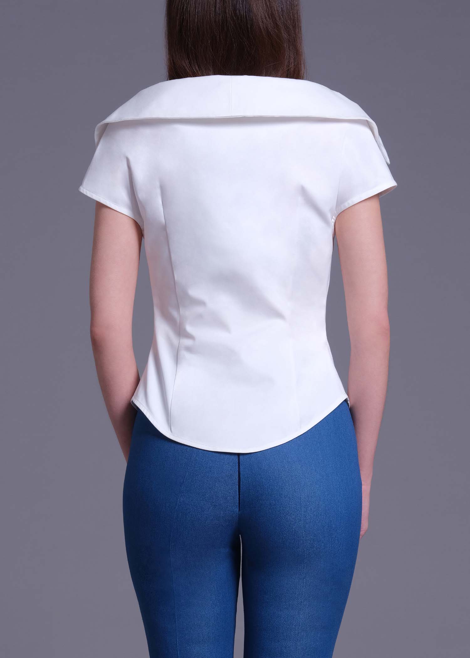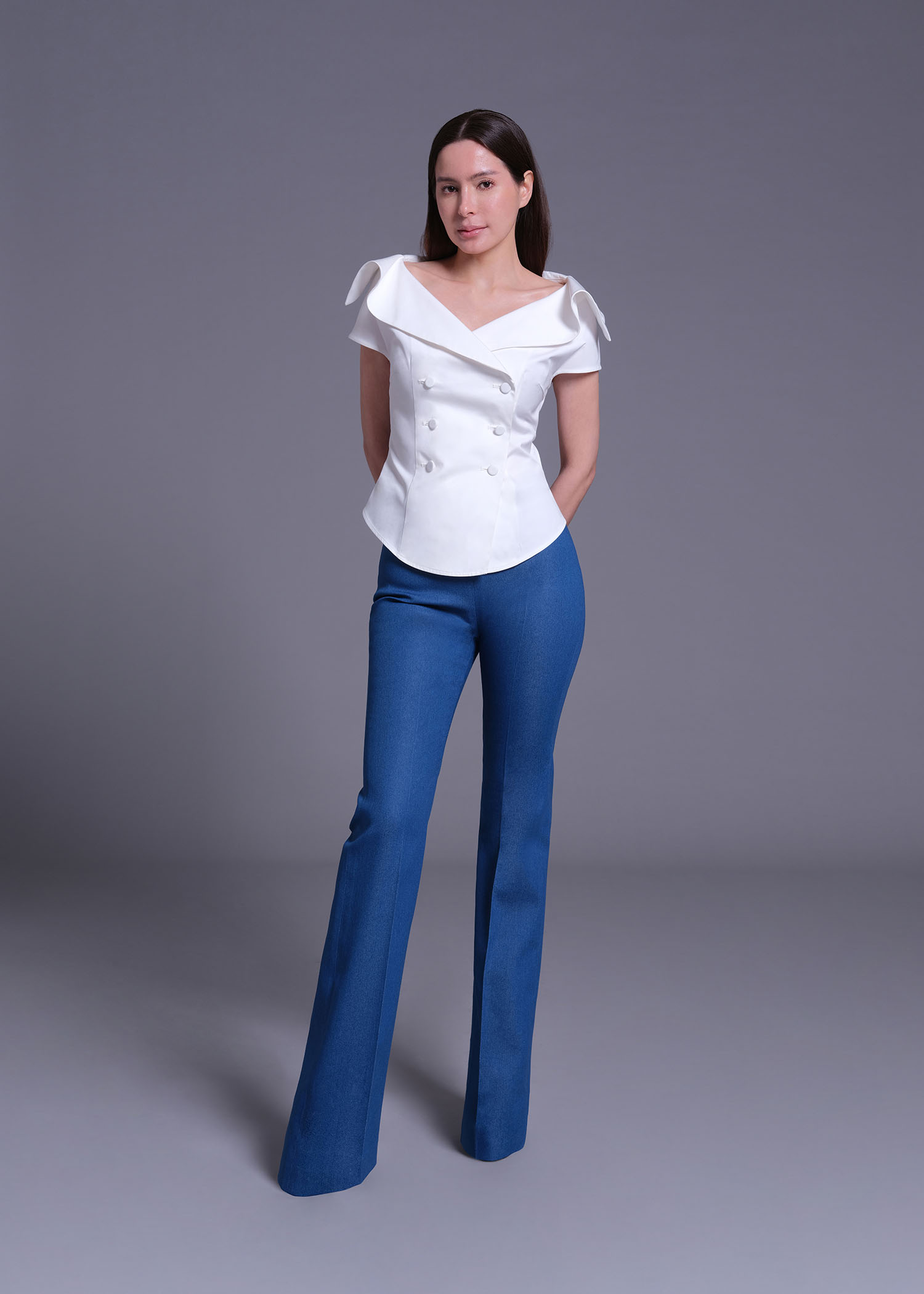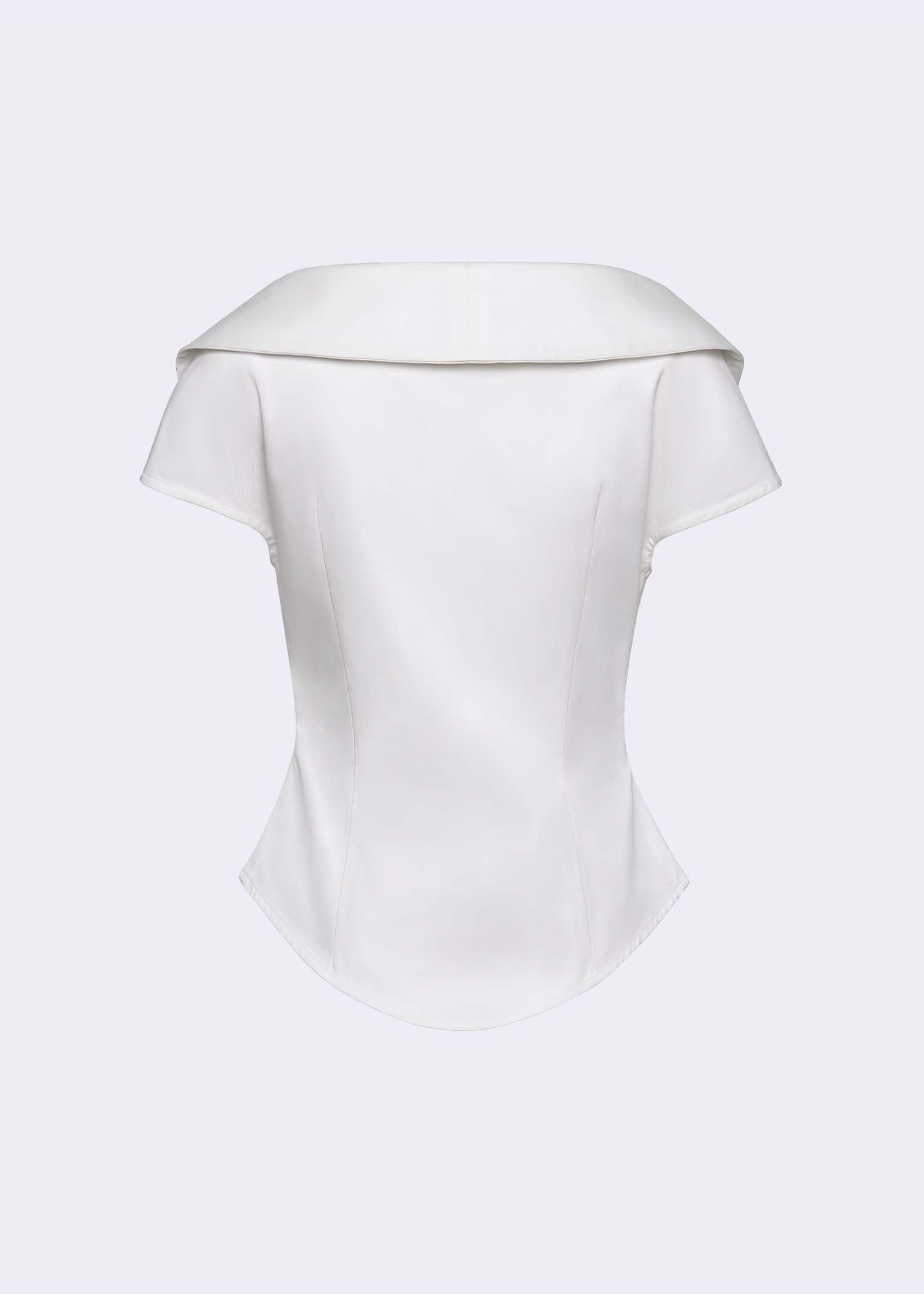 This off-white cotton blouse is tailored in a flattering double-breasted silhouette with a statement wide collar framed by delicate ruffled-shawl detailing. The sculpted waistline and clean finishing create a polished yet romantic aesthetic, making it ideal for elevated daywear or sophisticated evening styling.