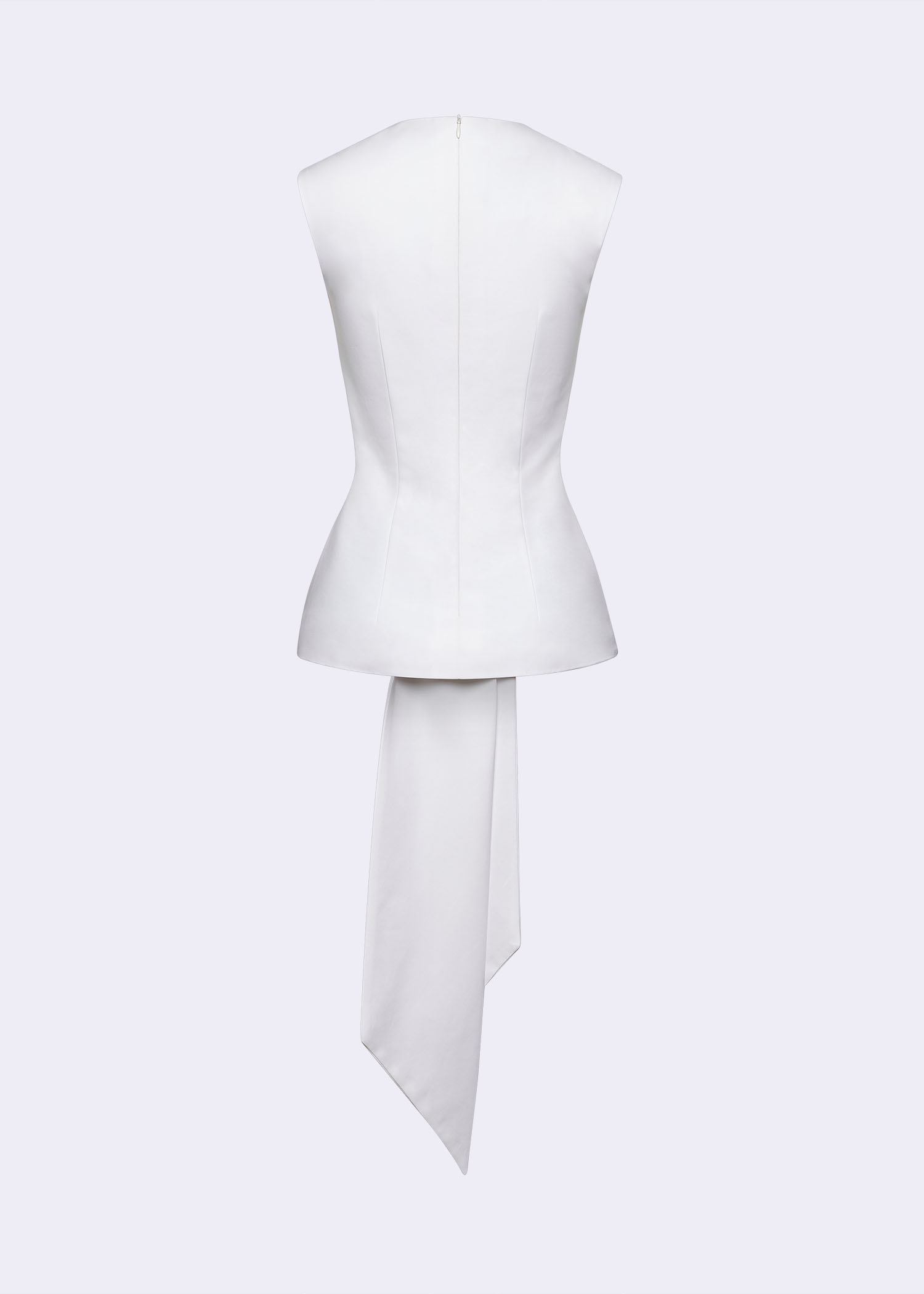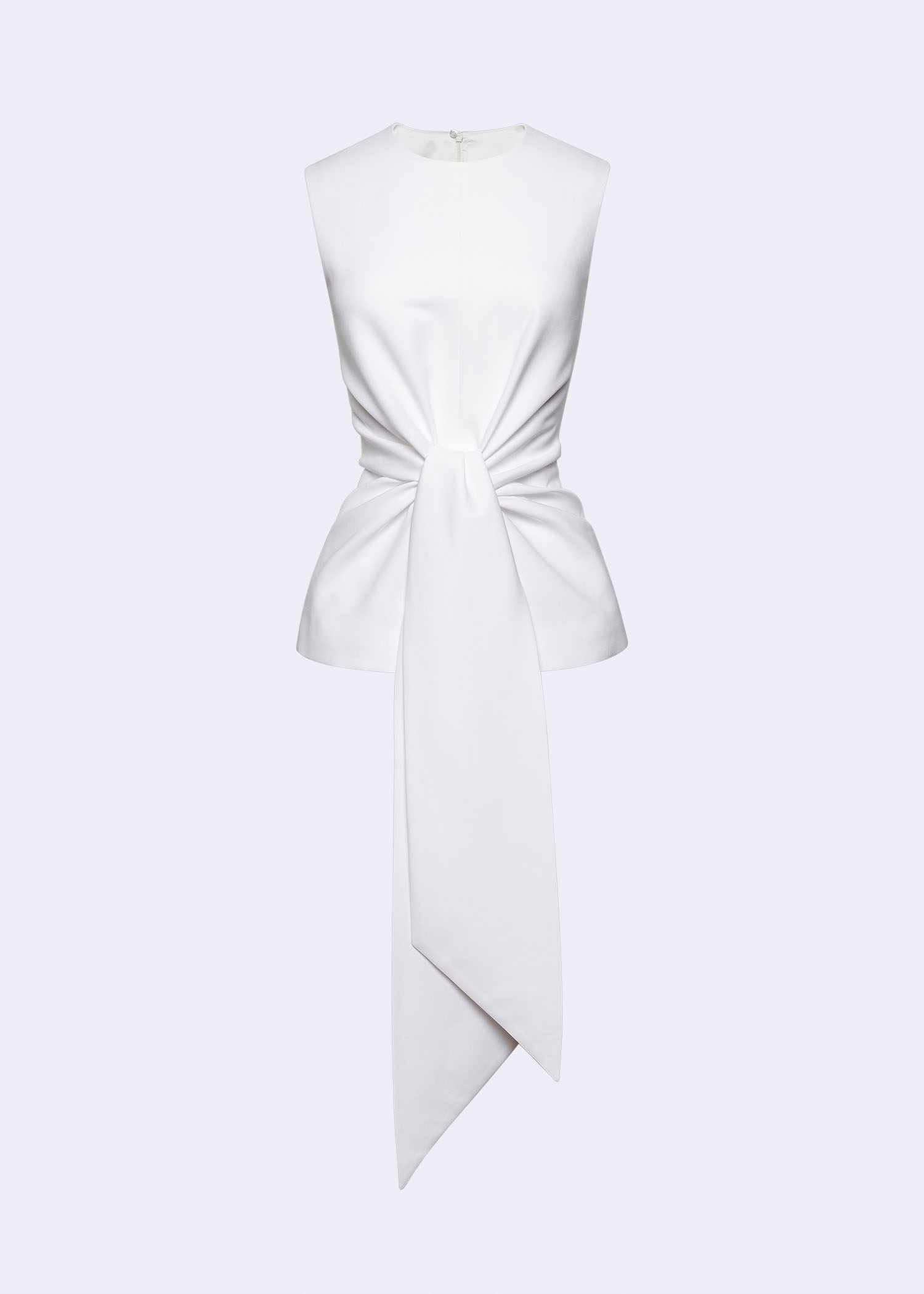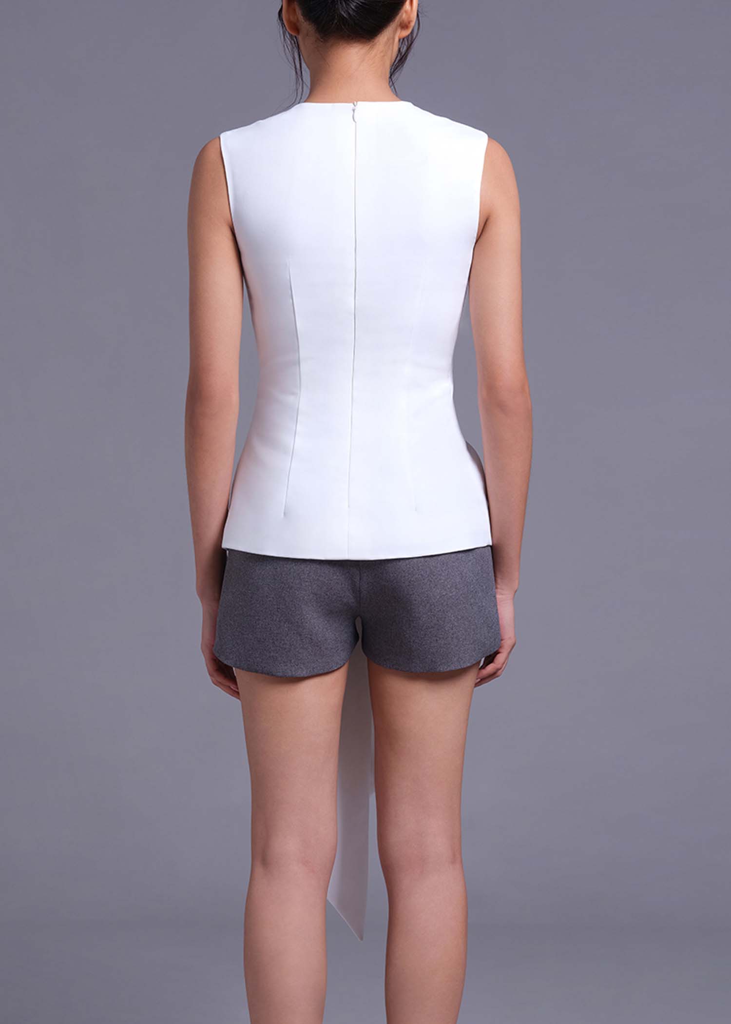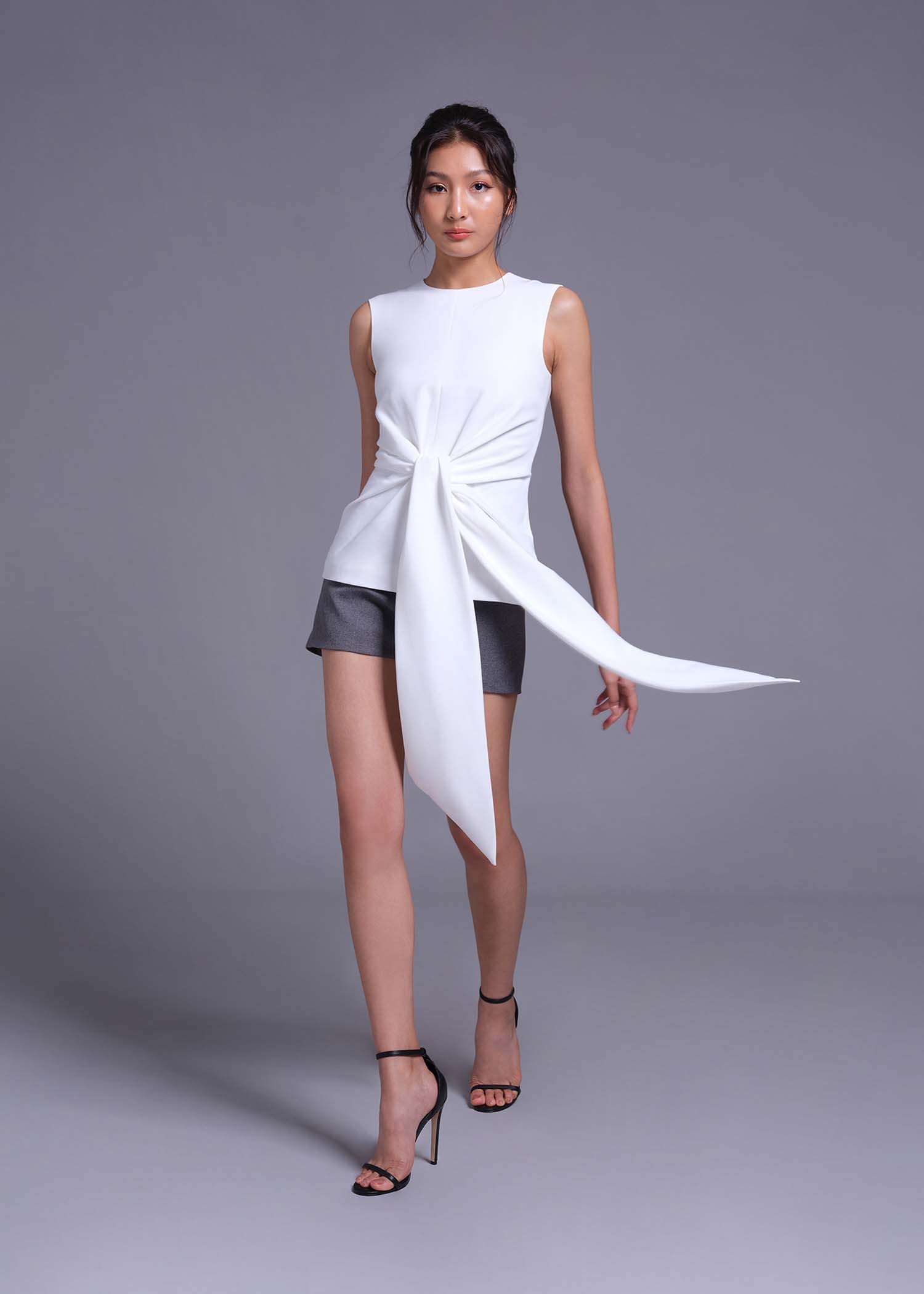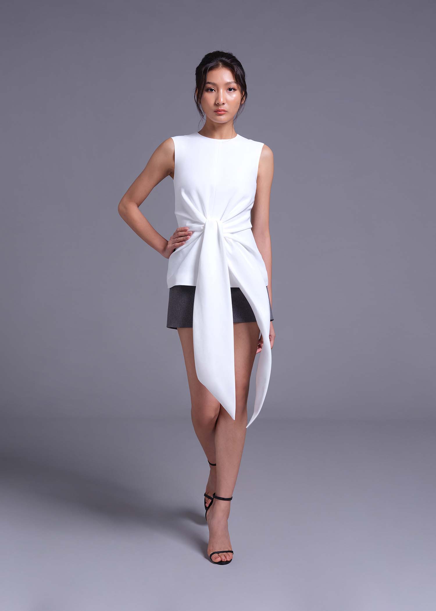 The off-white sleeveless shirt, designed with a unique waist twist detail for a flattering silhouette. Made from breathable, high-quality cotton, this top is perfect for warm-weather dressing while keeping you polished and elegant. Whether paired with tailored pants for a refined office look or styled with jeans for casual chic, this versatile piece is a must-have staple.