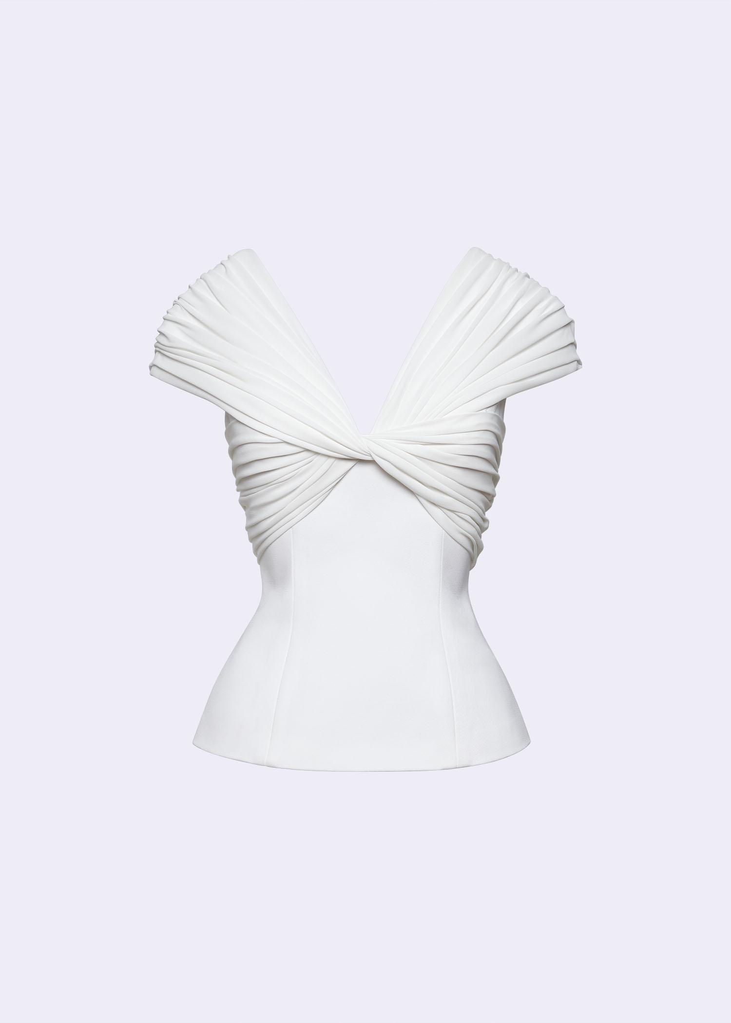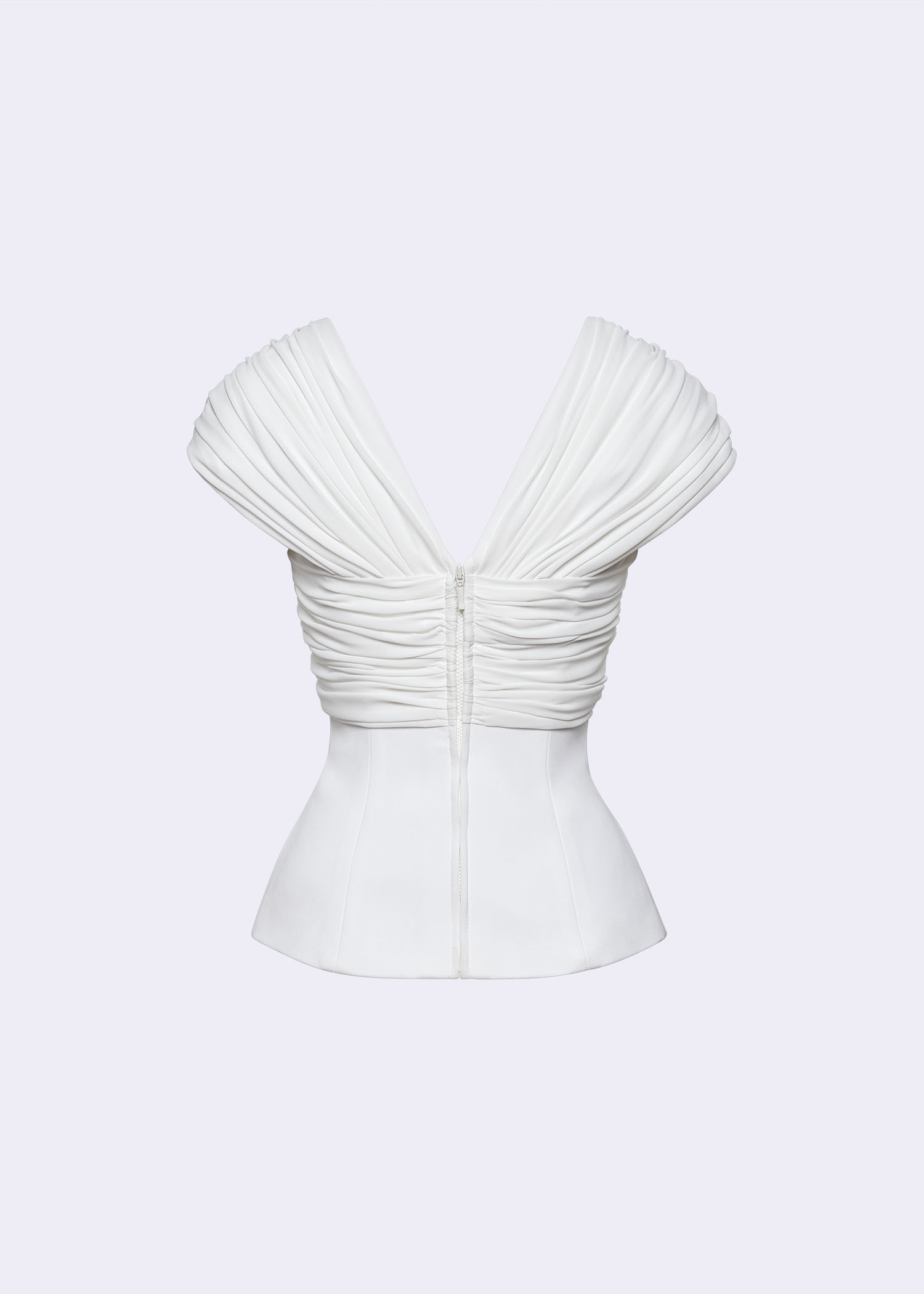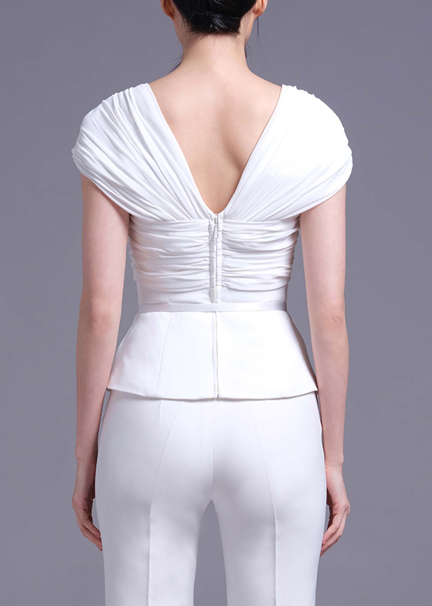 This off-white Top With draped detail, designed to bring effortless sophistication to any outfit. Featuring a beautifully draped silhouette, this top creates a soft and flattering look that works perfectly for both office wear and evening outings. Crafted from lightweight and breathable polyester, it offers all-day comfort with a polished finish. Pair it with tailored trousers for a professional ensemble or style it with a sleek skirt for a refined evening look.