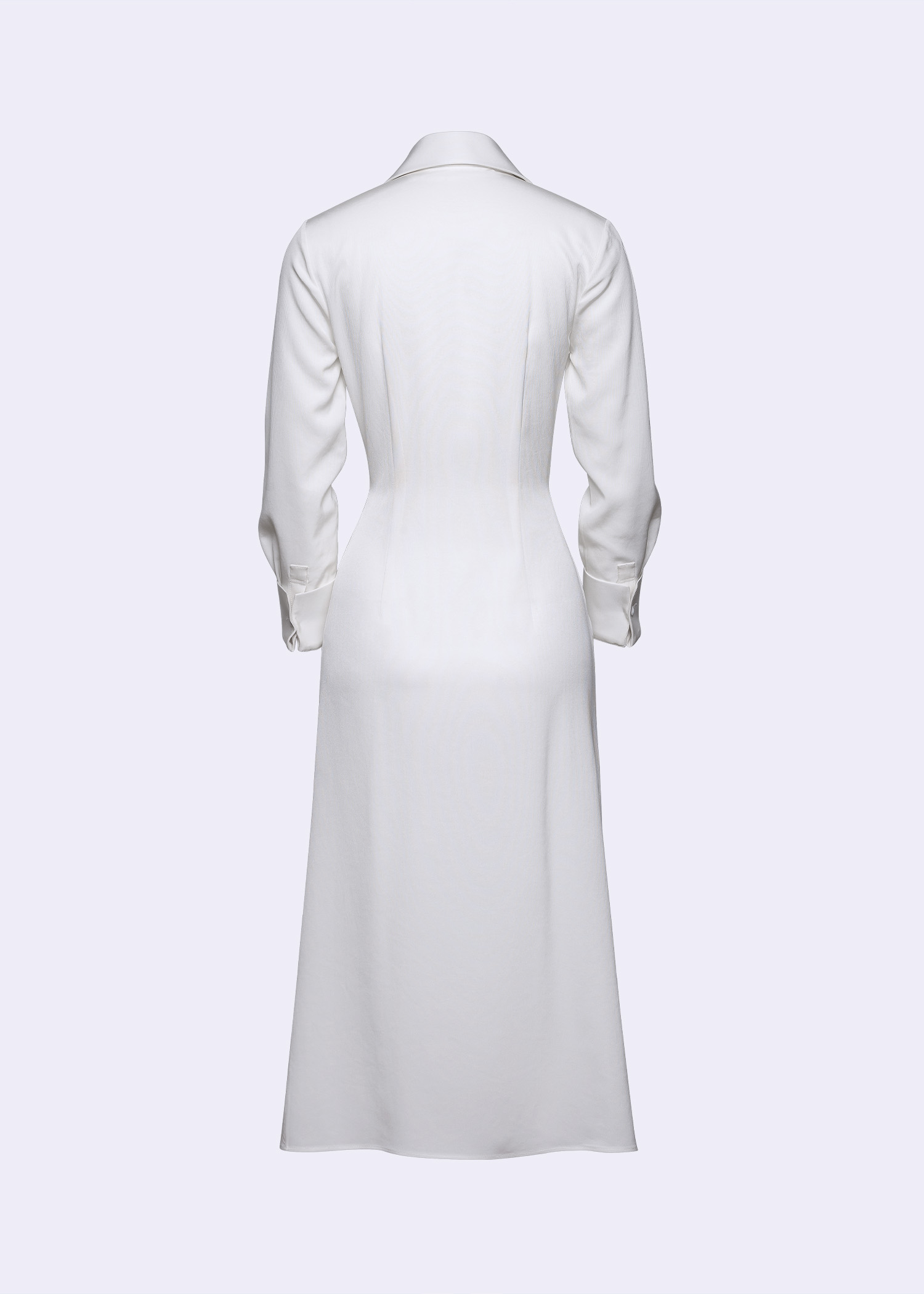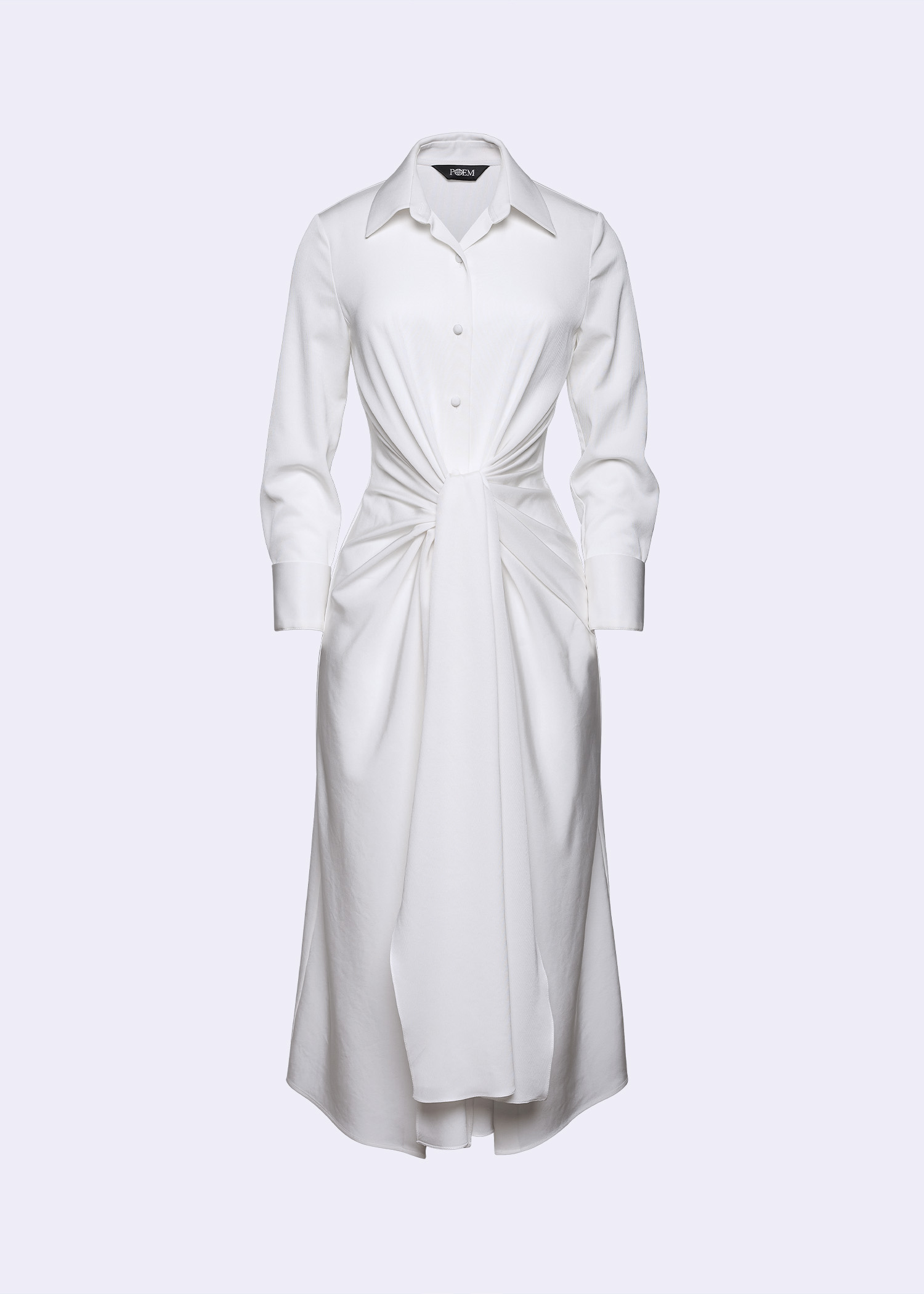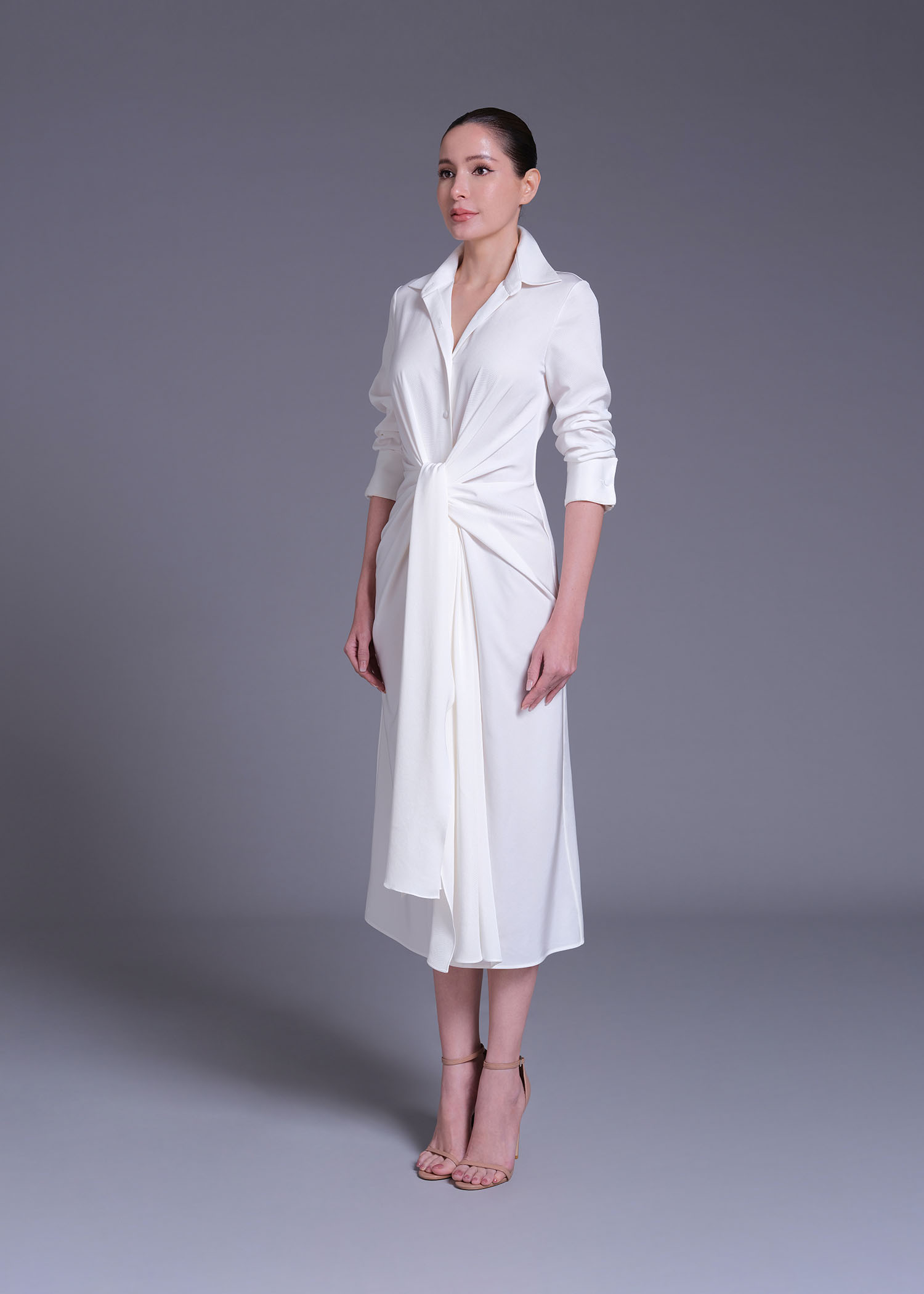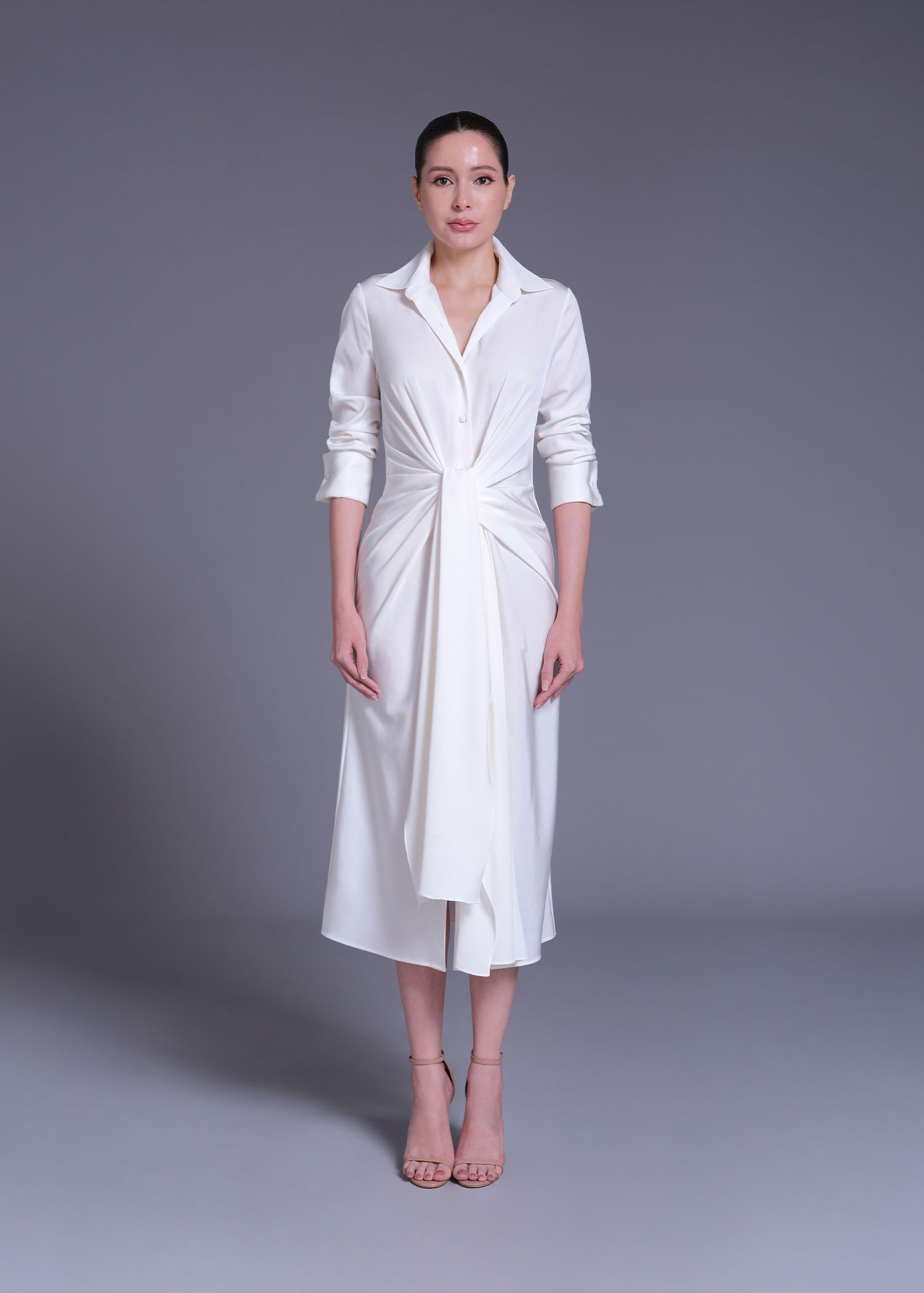 The “Pachelbel” Shirt Dress embodies understated elegance and contemporary tailoring. Crafted from luxurious tri-acetate polyester, this off-white midi dress showcases a graceful gathered-tie detail at the waist, creating a flattering draped silhouette that accentuates the figure with effortless sophistication. Designed with a classic shirt collar, button-down front, and long sleeves with structured cuffs, this piece seamlessly merges refined minimalism with modern femininity. The fluid texture of the fabric adds a subtle sheen and graceful movement, perfect for both day-to-night transitions. Pair it with nude heels or statement accessories for an elevated, polished look that transcends seasons.