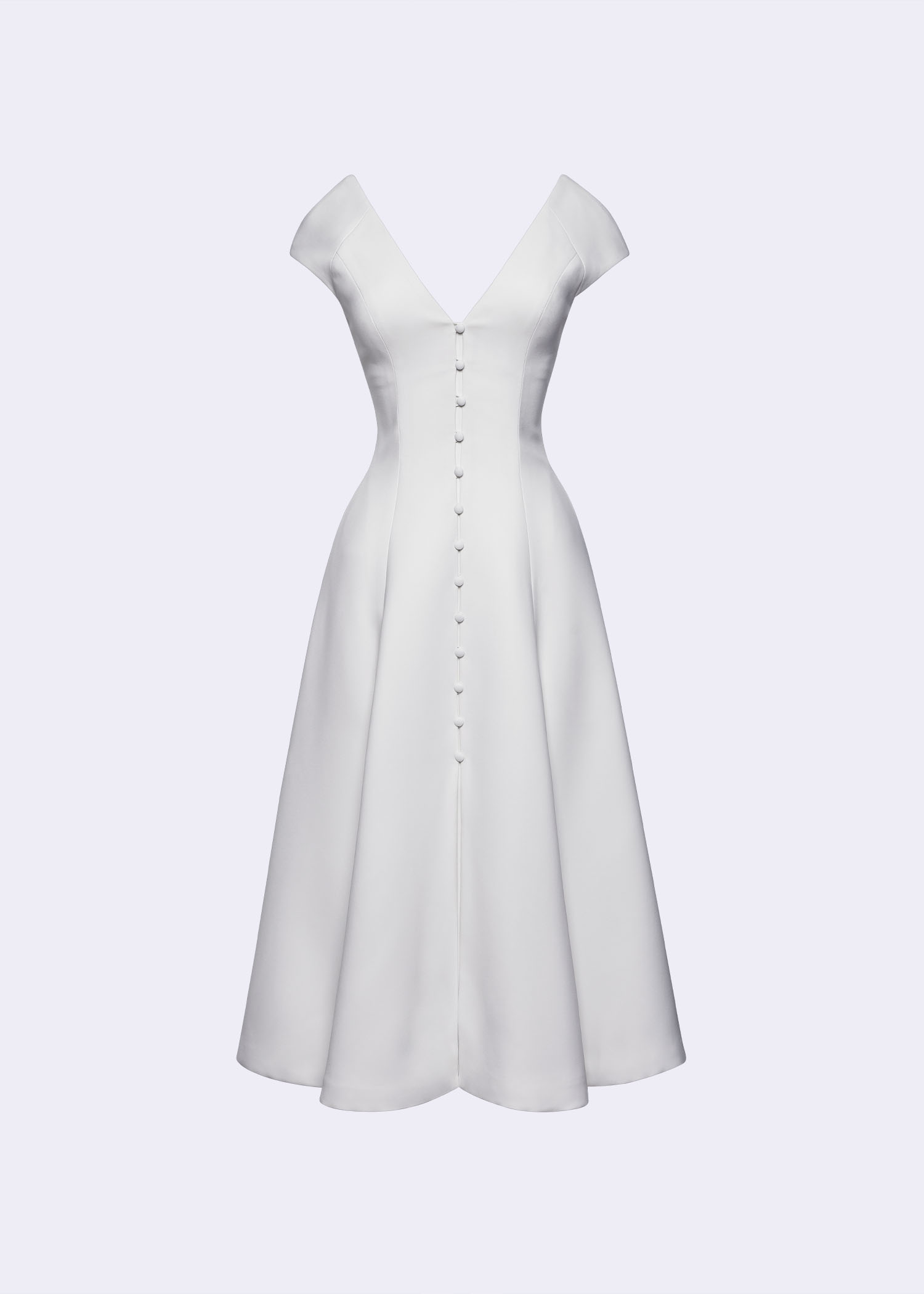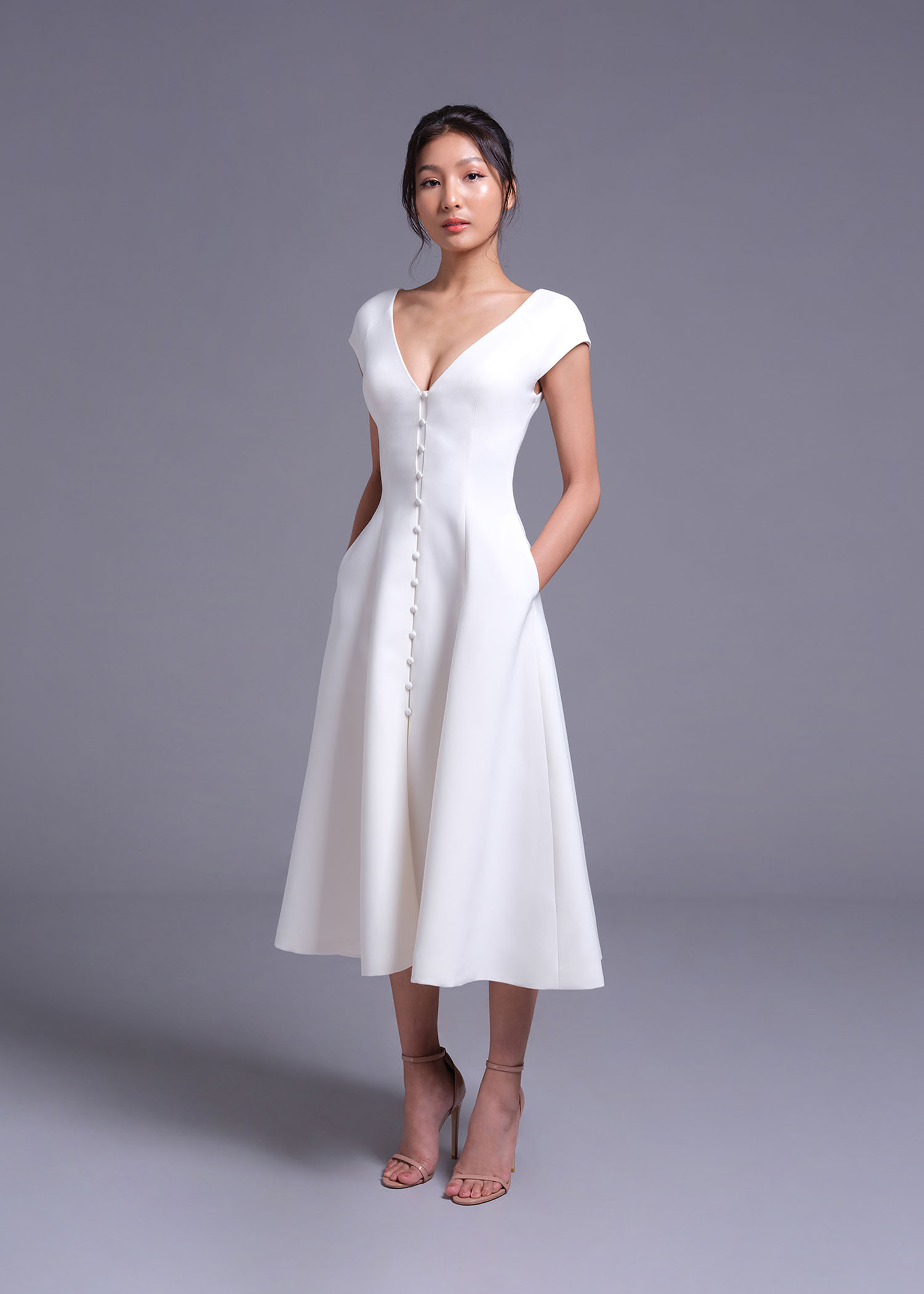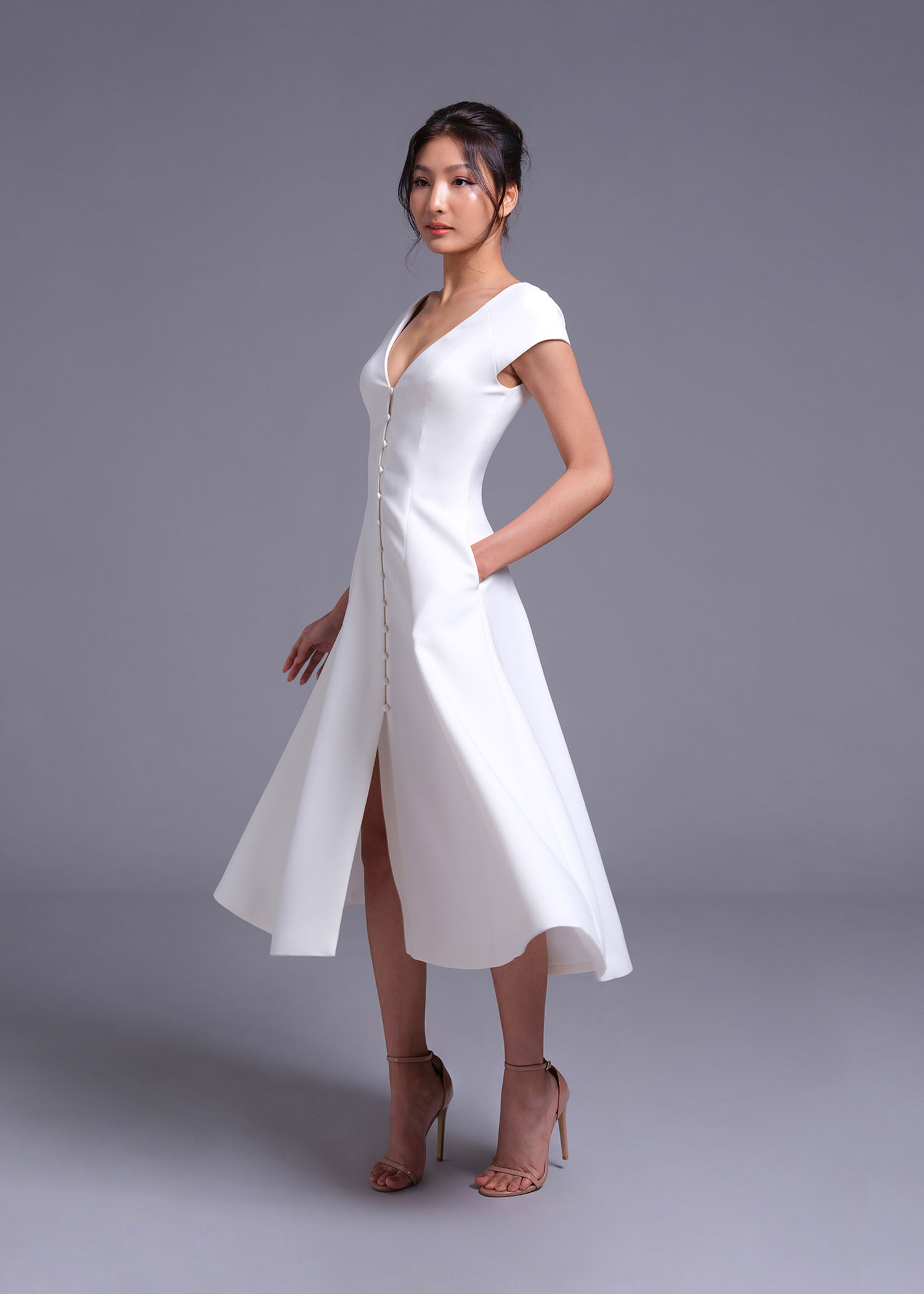 This chic off-white V-neck A-line dress. Designed for versatility, this dress features a flattering A-line silhouette that enhances your natural shape, while the button-down front adds a touch of sophistication. Made from soft, breathable polyester, it offers all-day comfort without compromising style. Whether paired with heels for a polished office look or sandals for a casual day out, this dress is a must-have for any modern wardrobe.