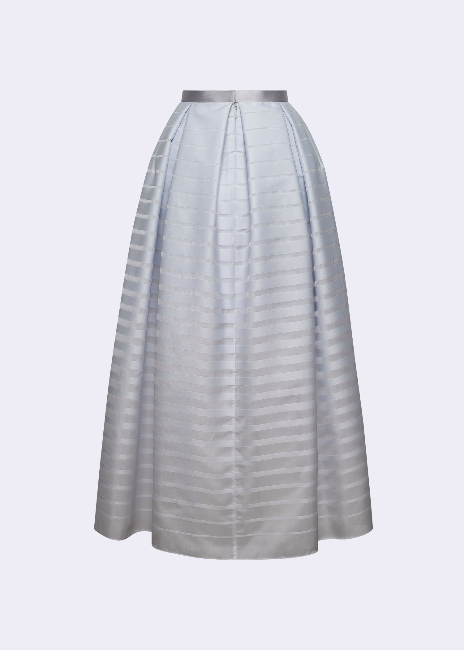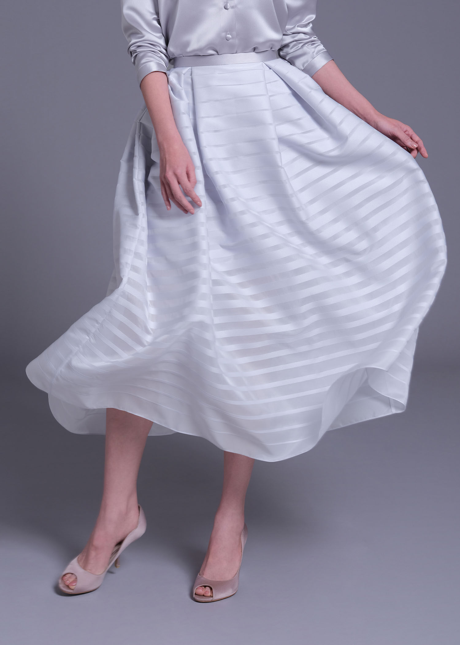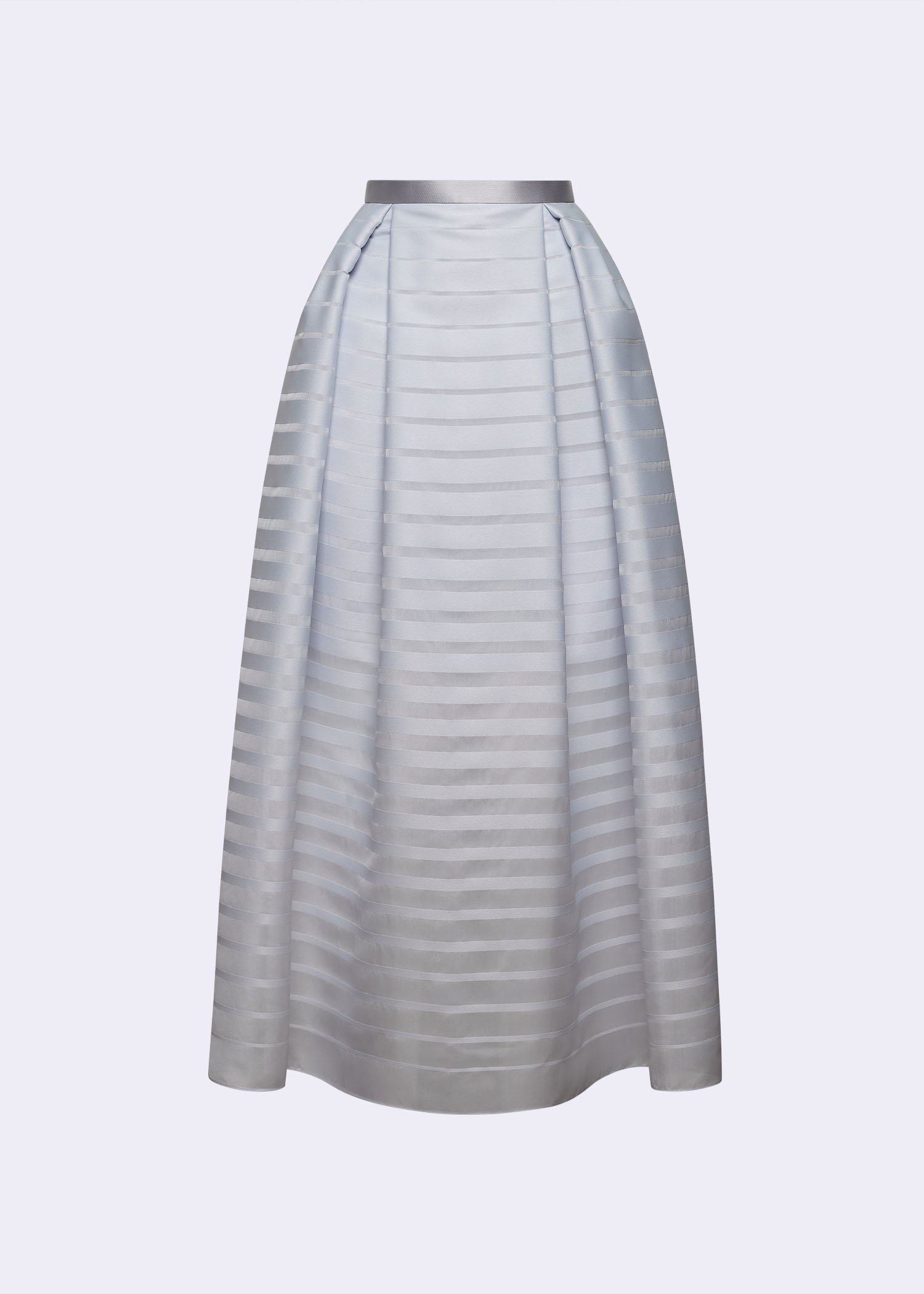 This pale-grey perspective-pattern pleated skirt embodies modern feminine elegance. The lightweight chiffon fabric is enhanced with a subtle jacquard texture that creates a sophisticated visual depth and fluid movement with every step. Designed in a flattering calf-length silhouette, the skirt features delicate pleating that adds dimension while maintaining a soft, airy structure. A smooth satin-crepe waistband provides a polished contrast and defines the waistline for a clean, elevated finish. Perfect for both formal occasions and contemporary daywear, this versatile piece pairs beautifully with structured blouses or relaxed knit tops for a timeless yet fashion-forward look.