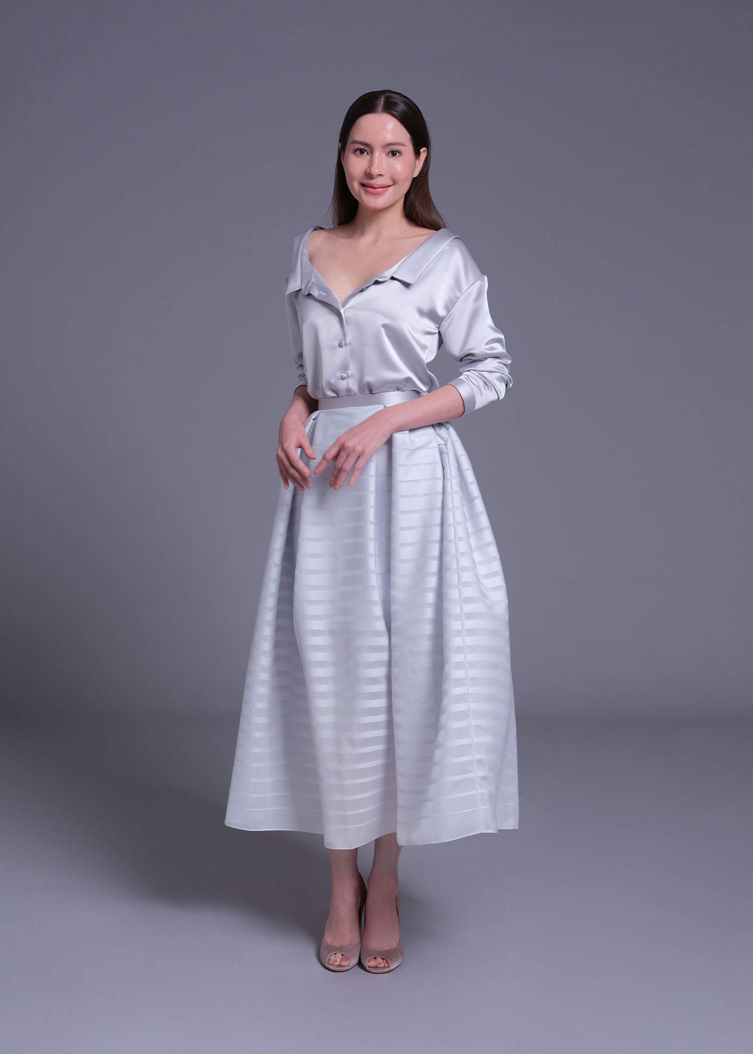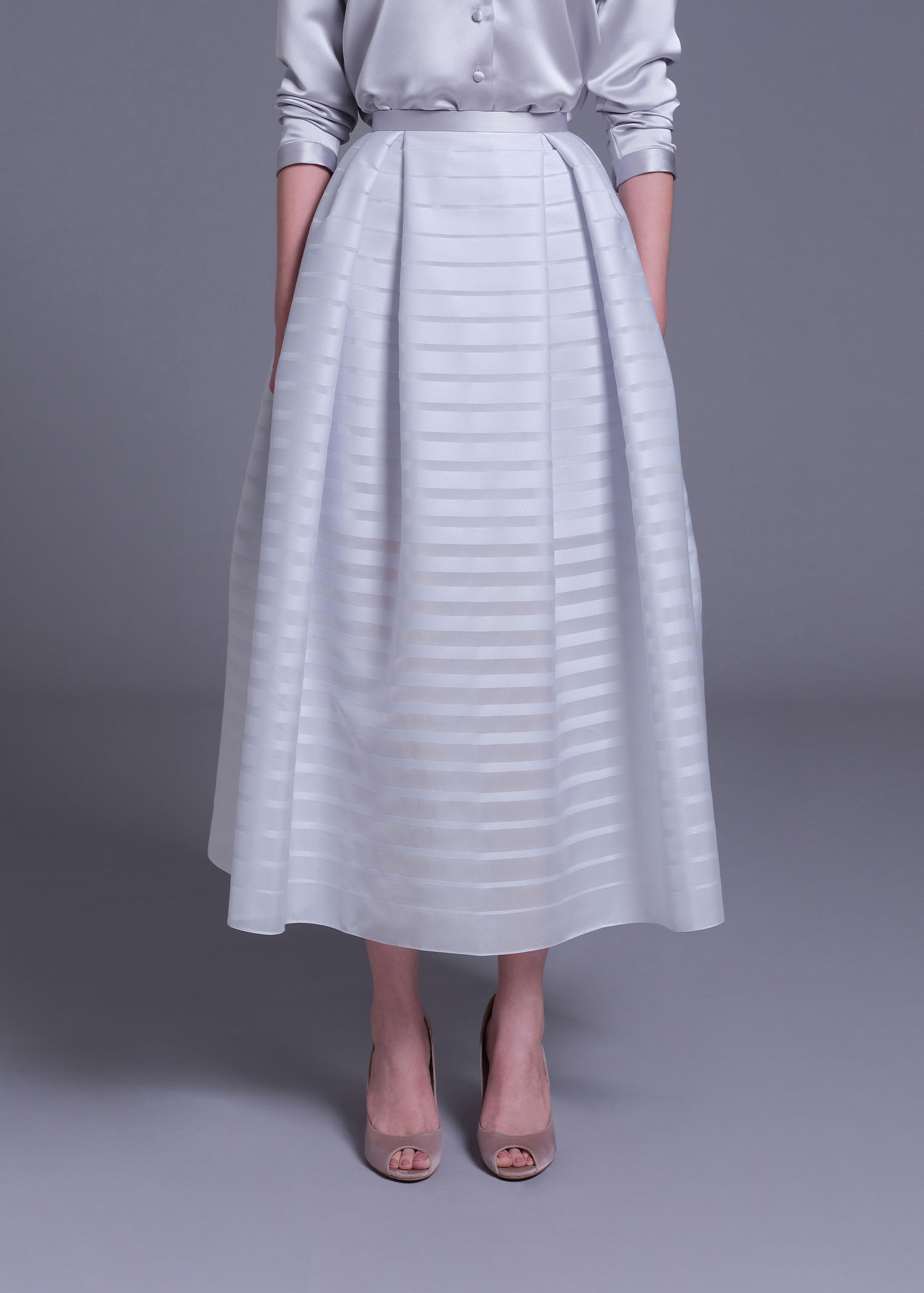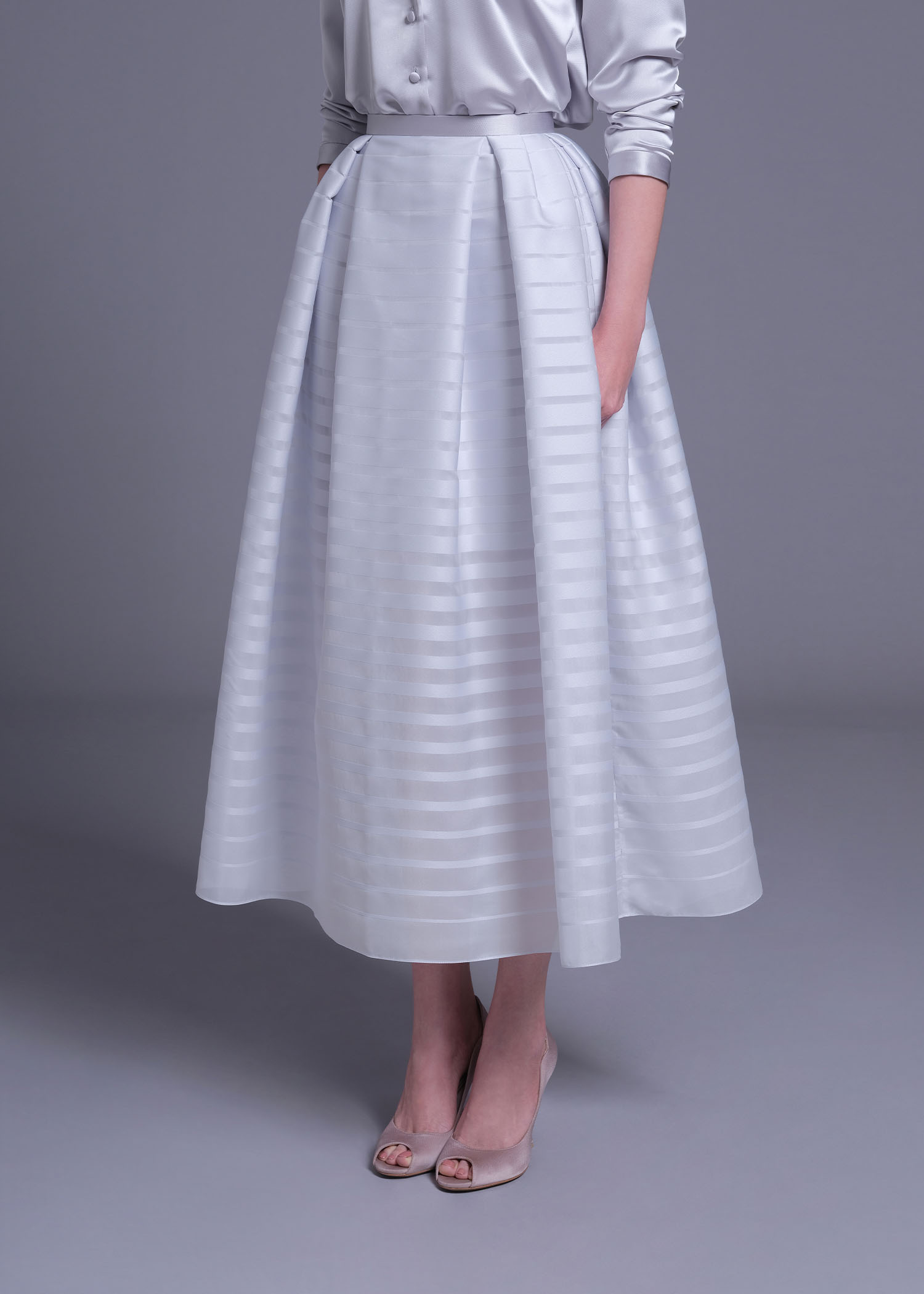 This pale-grey perspective-pattern pleated skirt embodies modern feminine elegance. The lightweight chiffon fabric is enhanced with a subtle jacquard texture that creates a sophisticated visual depth and fluid movement with every step. Designed in a flattering calf-length silhouette, the skirt features delicate pleating that adds dimension while maintaining a soft, airy structure. A smooth satin-crepe waistband provides a polished contrast and defines the waistline for a clean, elevated finish. Perfect for both formal occasions and contemporary daywear, this versatile piece pairs beautifully with structured blouses or relaxed knit tops for a timeless yet fashion-forward look.