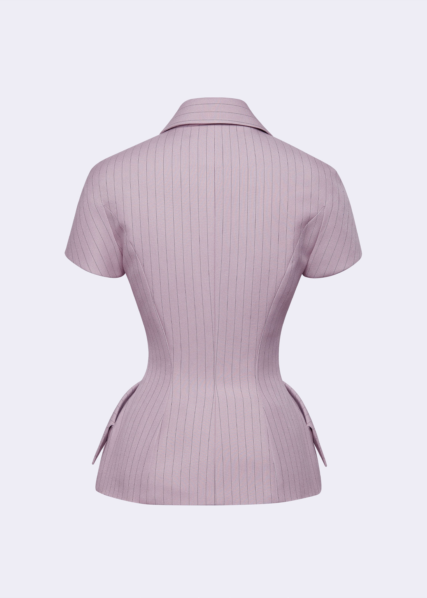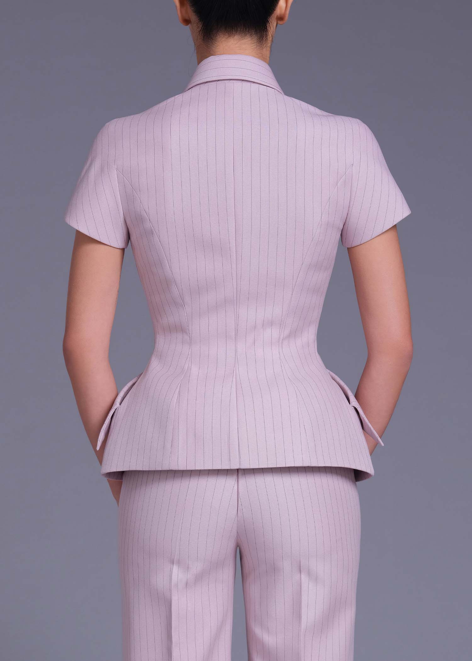 The “Aube” Double-Breasted Jacket blends classic tailoring with modern elegance. Crafted from a soft cotton-rayon blend in a refined pink pinstripe, this jacket showcases a structured silhouette with short sleeves and a defined waist. Its double-breasted front with contrast buttons enhances its polished look, while the subtle peplum-style waist detail adds a touch of femininity. Designed for versatility, the “Aube” jacket transitions seamlessly from professional settings to chic evening gatherings, embodying sophistication and contemporary style.