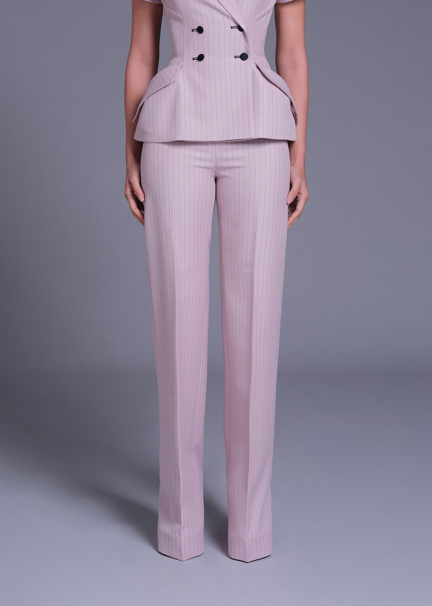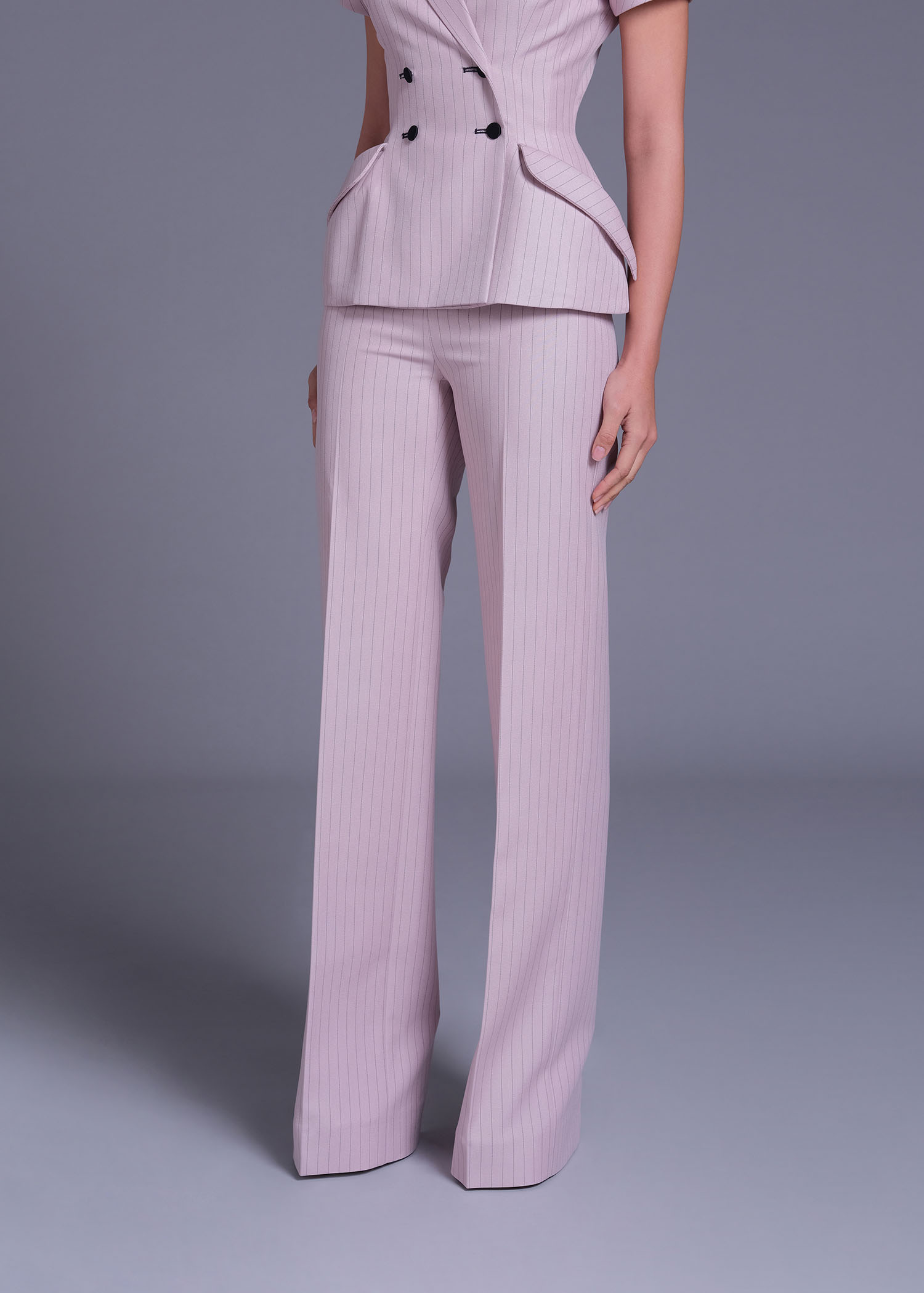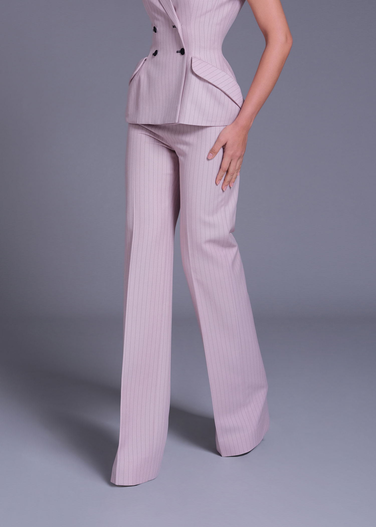 The Pink Pinstripe “Rocket” Column Pants. Crafted from a soft cotton-rayon blend, these trousers combine comfort with refined tailoring. The sleek column silhouette and subtle pinstripe pattern elongate the figure, while the soft pink hue adds a feminine yet modern touch. Perfect for pairing with blazers or blouses, these column pants transition seamlessly from professional settings to evening occasions.