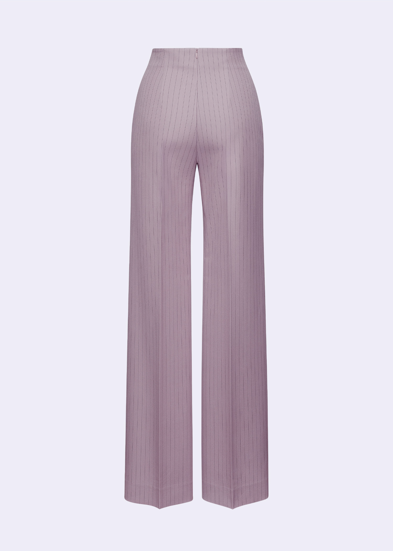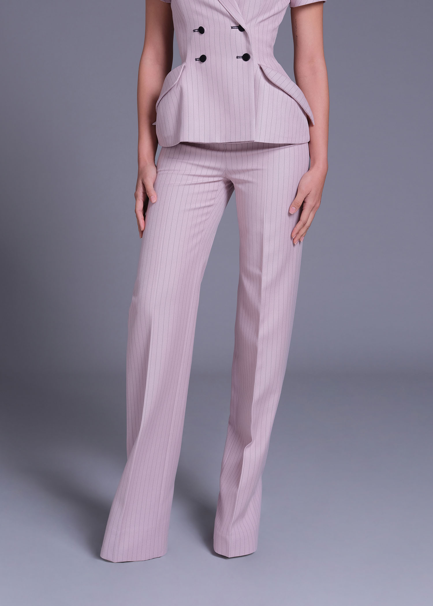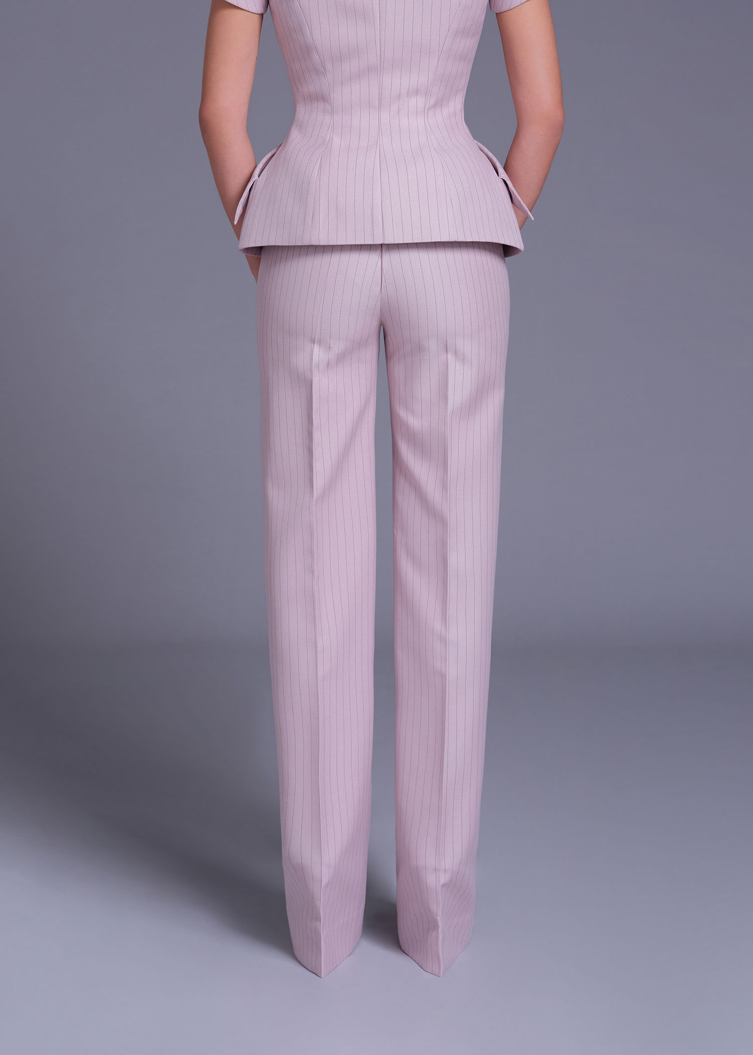The Pink Pinstripe “Rocket” Column Pants. Crafted from a soft cotton-rayon blend, these trousers combine comfort with refined tailoring. The sleek column silhouette and subtle pinstripe pattern elongate the figure, while the soft pink hue adds a feminine yet modern touch. Perfect for pairing with blazers or blouses, these column pants transition seamlessly from professional settings to evening occasions.
