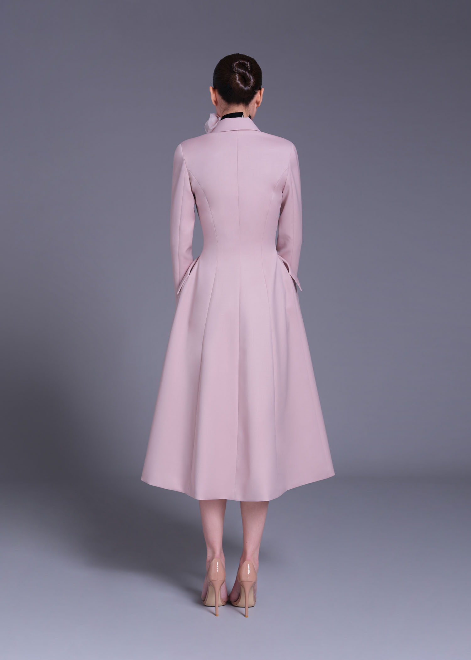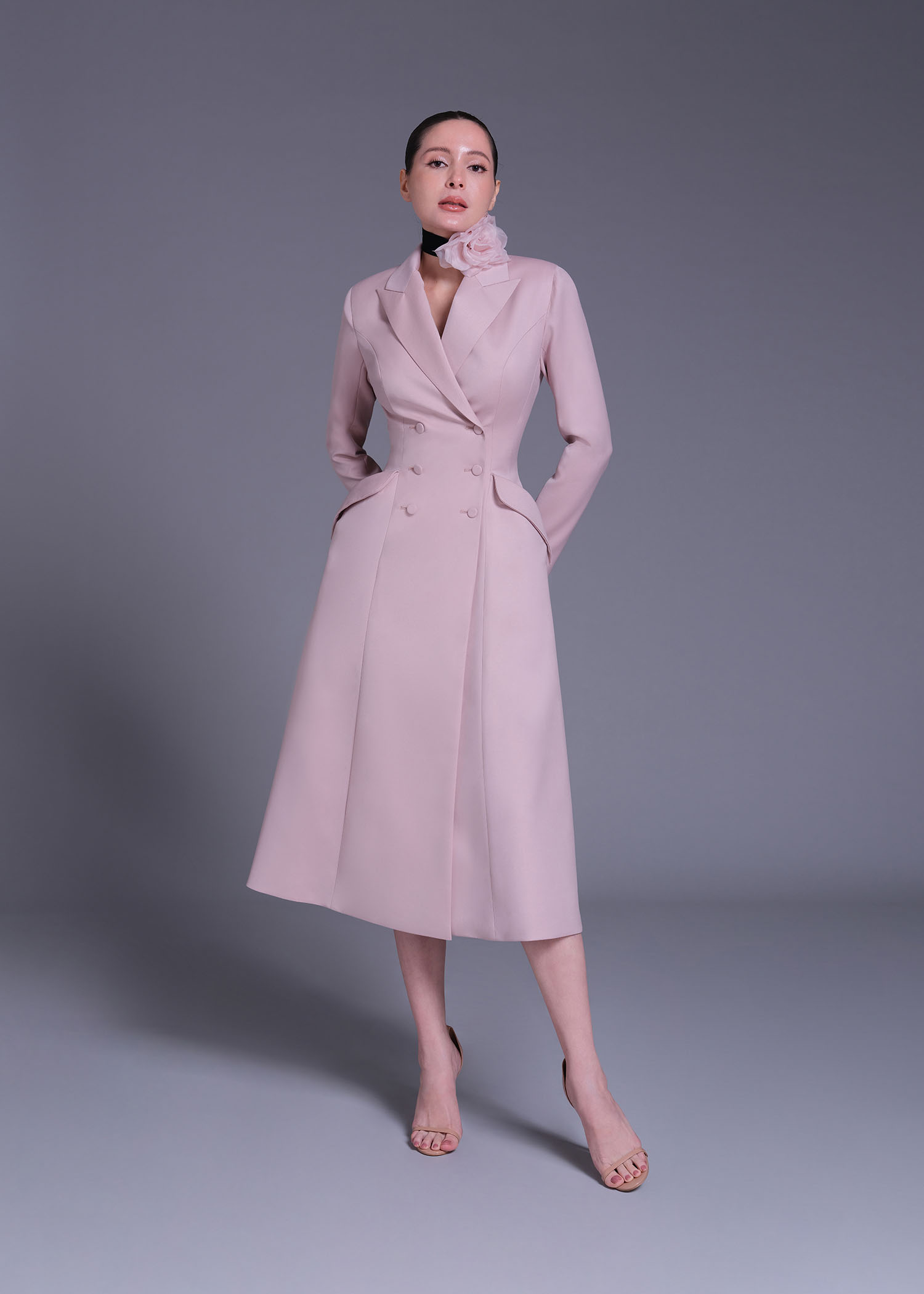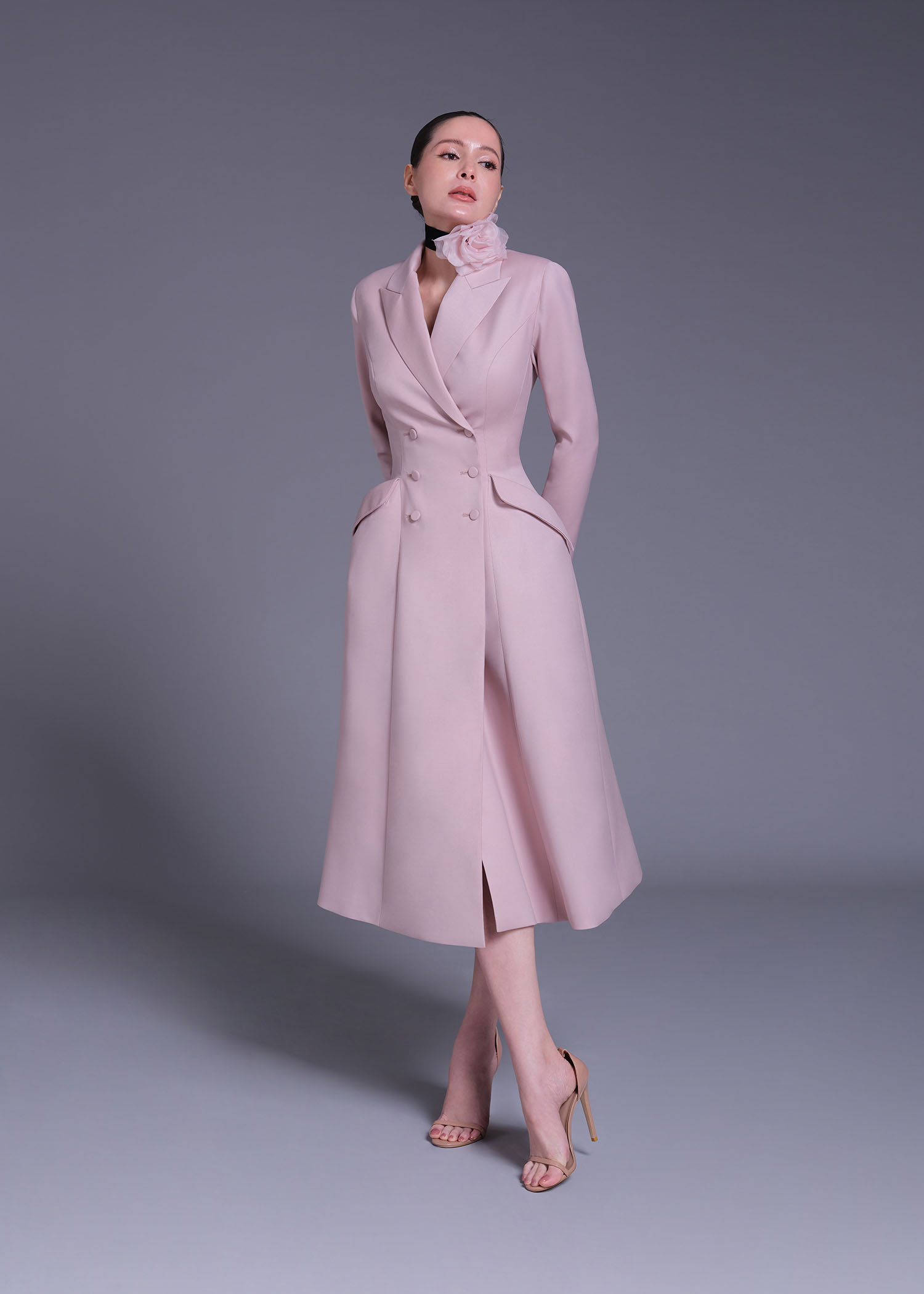 The pink wool “Cecile Brunner” double-breasted coat is a timeless statement of elegance and refined craftsmanship. Designed with a longline silhouette and structured shoulders, it highlights precision tailoring and feminine sophistication. Crafted from premium wool, its delicate blush hue evokes softness while maintaining a powerful presence. Perfect for formal occasions, transitional layering, and polished day-to-evening looks, the “Cecile Brunner” coat embodies modern classic luxury.