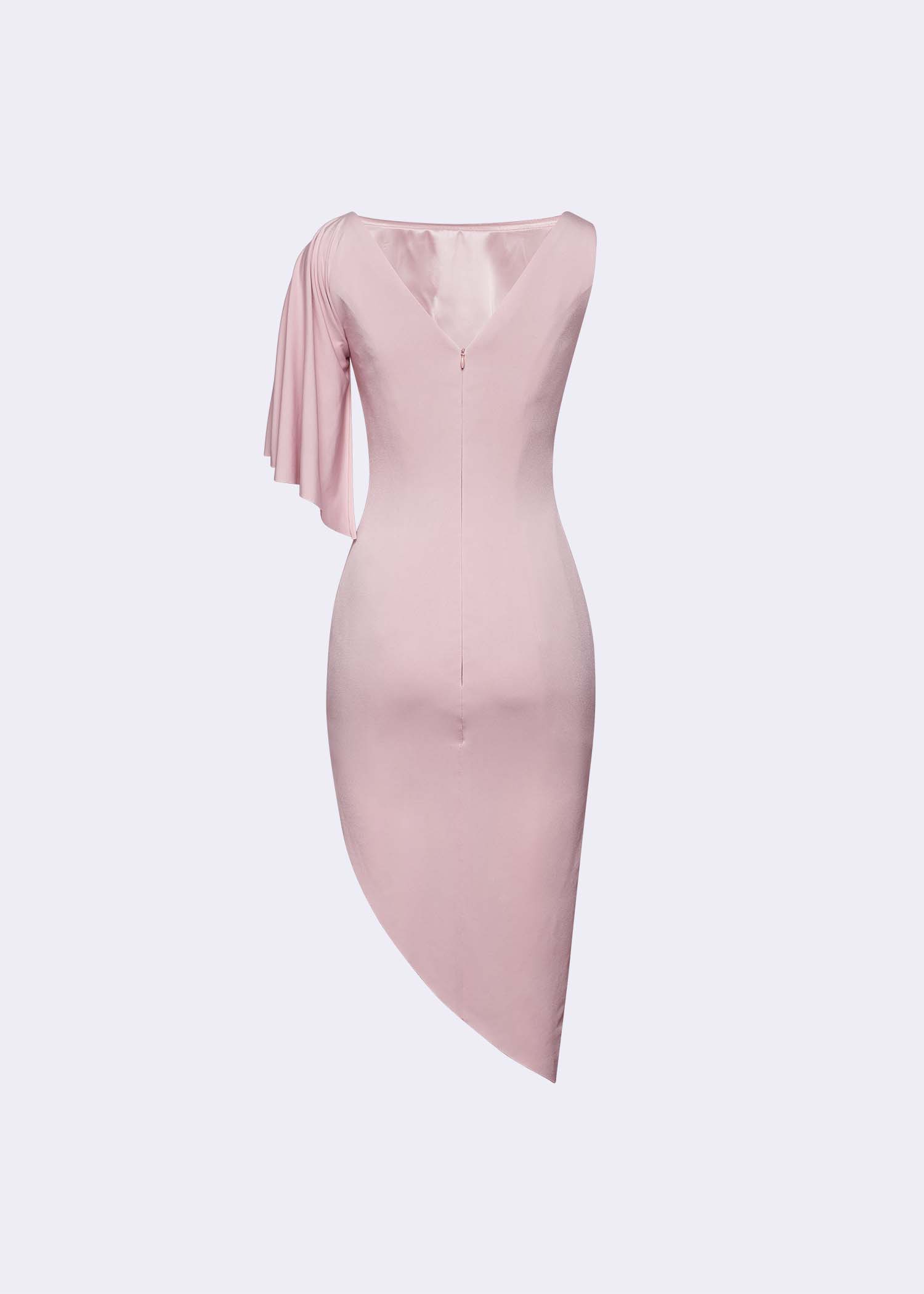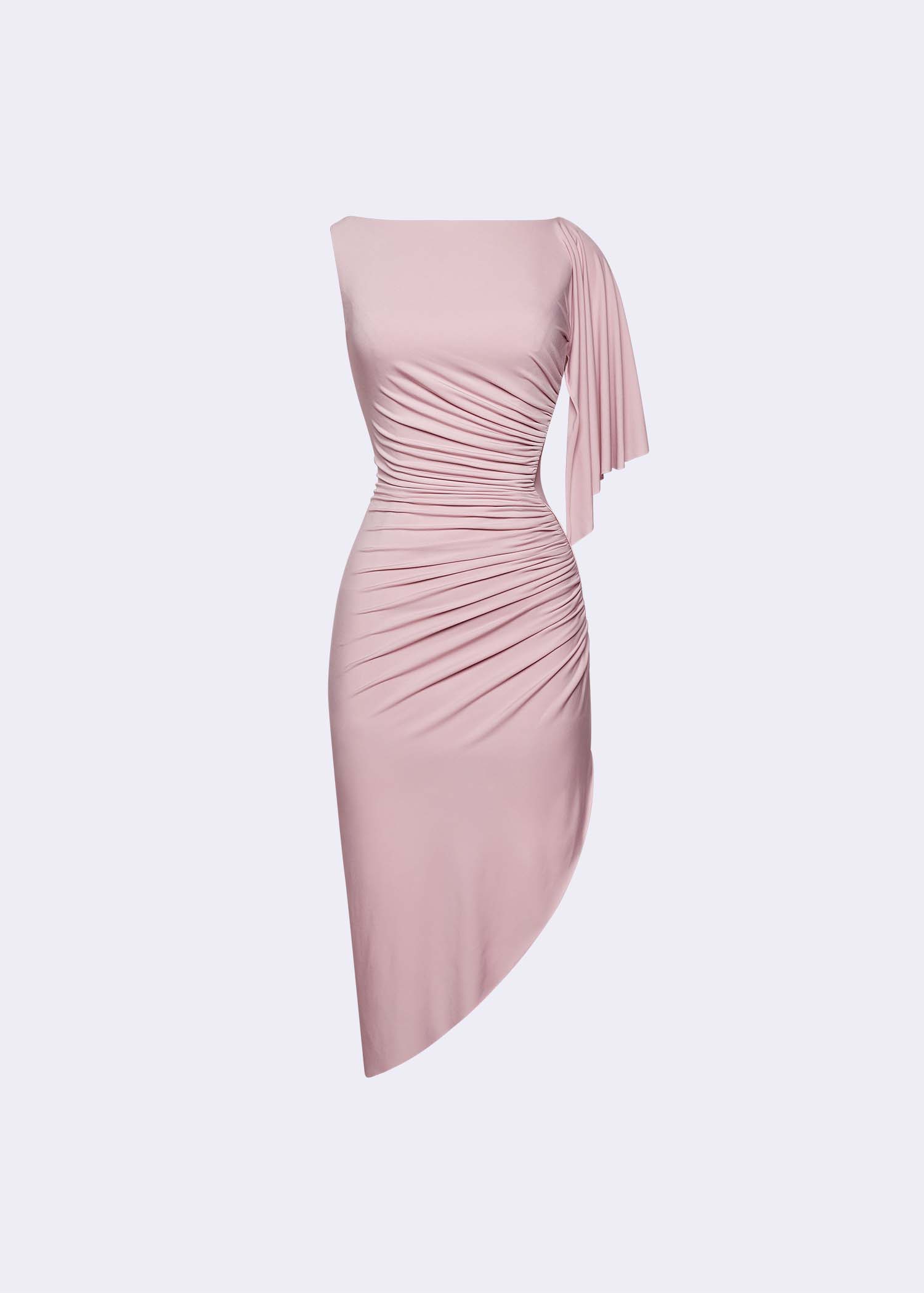 This stunning powder pink draped asymmetric dress, designed to move gracefully with every step. Crafted from a soft stretchy polyester-spandex blend, the fabric hugs and flows in all the right places, offering a flattering silhouette with exceptional comfort. The asymmetrical hemline and artful draping bring a touch of modern femininity, while the blush-toned hue adds romance and softness to your look. Ideal for weddings, evening events, or statement daytime styling, this piece effortlessly balances structure and fluidity. Whether paired with strappy heels or minimalist accessories, this dress is your perfect go-to for special occasions that call for understated glamour.