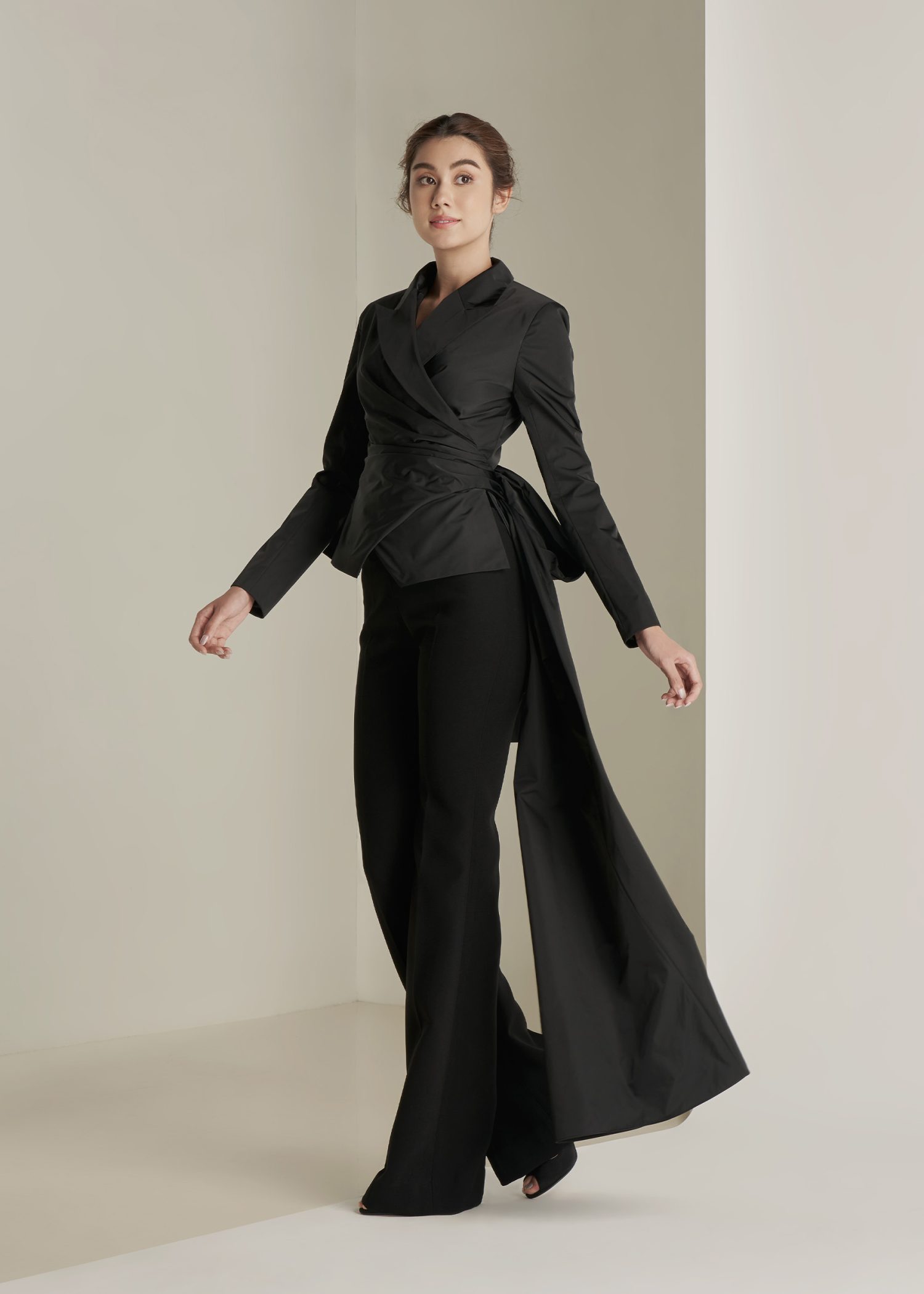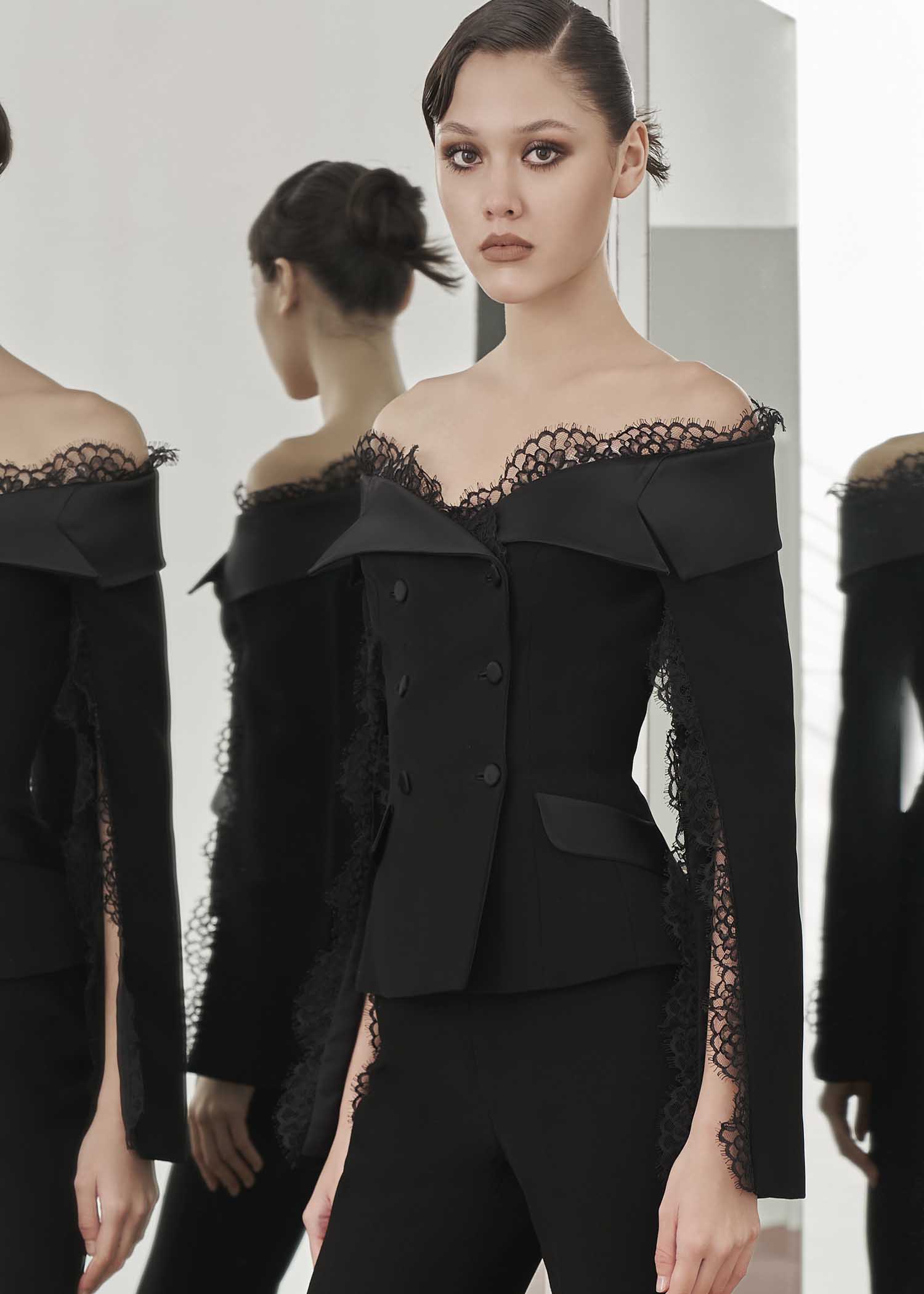 Black “Calla Lily” Ruffle Shawl Collar Double-Breasted Jacket