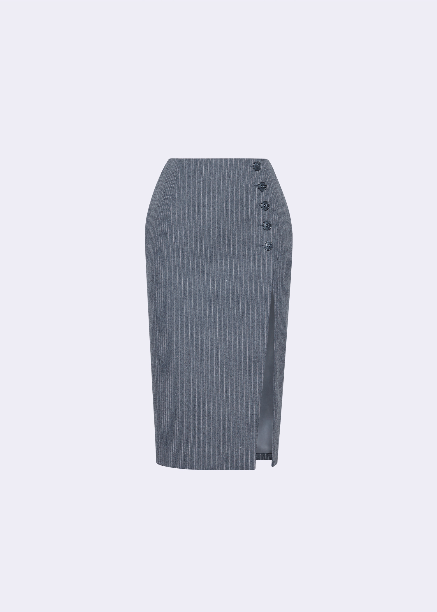 Grey Pinstripe Wool Pencil Skirt with Thigh Slit